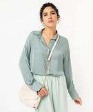 Craquez pour l’élégance de cette chemise à manches longues. Une chemise unie confectionnée dans une matière satinée au toucher très doux. Cette chemise femme possède un col ouvert et se ferme par une rangée de boutons aspect nacre. Ses manches sont terminées par un large biais boutonné. La coupe ample avec épaules tombantes assure à cette chemise une allure loose au top de la tendance. Une chemise de soirée à porter avec un pantalon en toile et des escarpins pour une allure chic en toute simplicité. Bas arrondi.