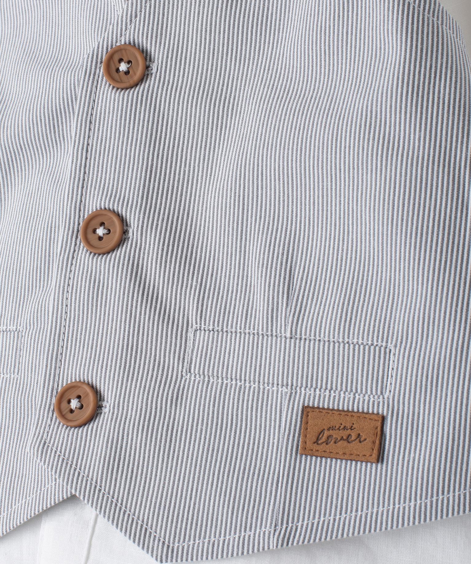 Cette chemise de cérémonie bébé garçon sera parfaite pour les grandes occasions. Elle assure aux tout-petits un look élégant tout en restant parfaitement confortable. Cette chemise effet 2 en 1 se compose d’une chemise à manches longues et d’un petit gilet de costume cousu sur l’avant. On craque pour les nombreux détails chics : fausses poches raglan avec patch brodé, petites pinces, finitions en pointe sur l’avant et boutons contrastants. En plus, cette chemise possède un nœud papillon amovible qui se fixe par scratch. Fermeture boutons.