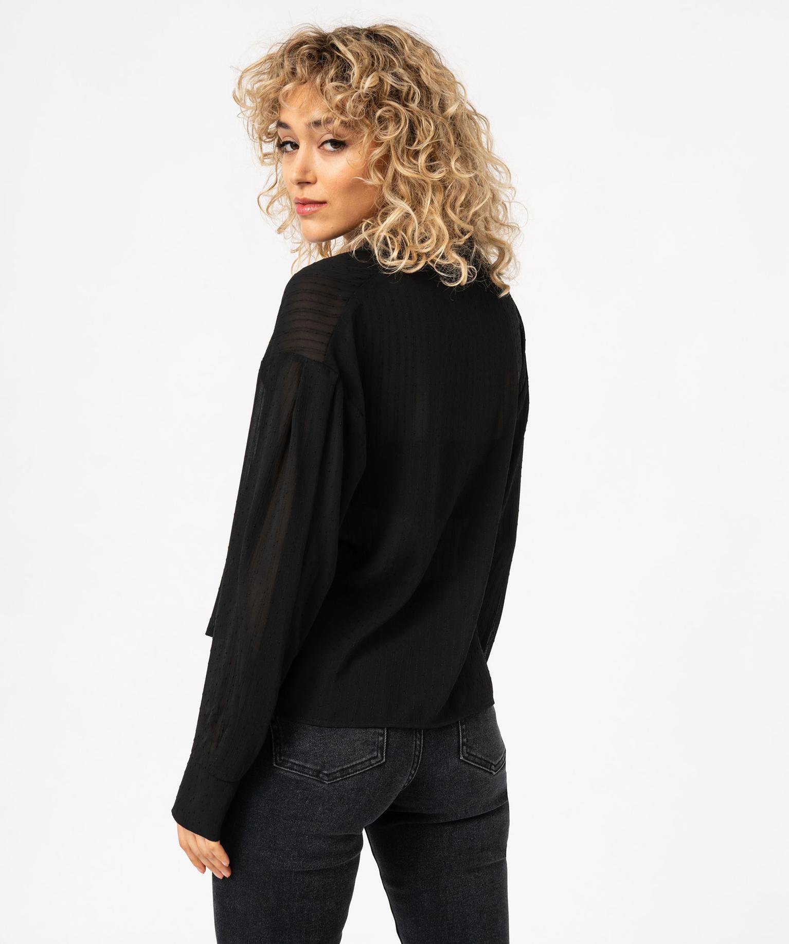 Cette jolie chemise transparente apportera une touche de sophistication à tous vos looks. Confectionnée dans une matière voile fluide, elle affiche de fines rayures et de petits motifs en relief. Cette chemise femme possède de larges manches avec pli sur l’épaule et un biais aux poignets. Elle arbore un col classique et une fermeture par de petits boutons aux reflets nacrés. Un haut de soirée à porter sur un top à bretelles, avec un pantalon de smoking, idéal pour les fêtes de fin d'année et toutes les occasions festives.