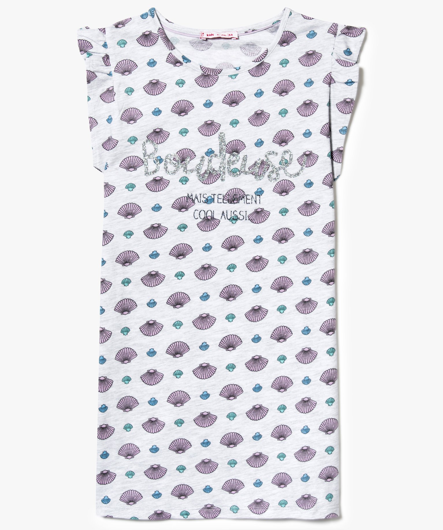 Craquez pour cette jolie chemise de nuit pour fille tellement girly. Avec son imprimé coquillage et ses petits empiècements volantés sur les épaules, elle plaira à coup sûr à toutes les petites fashionistas. Une inscription pailletée sur l'avant permettra d'illuminer cette chemise de nuit pour accompagner les fillettes au pays des rêves.