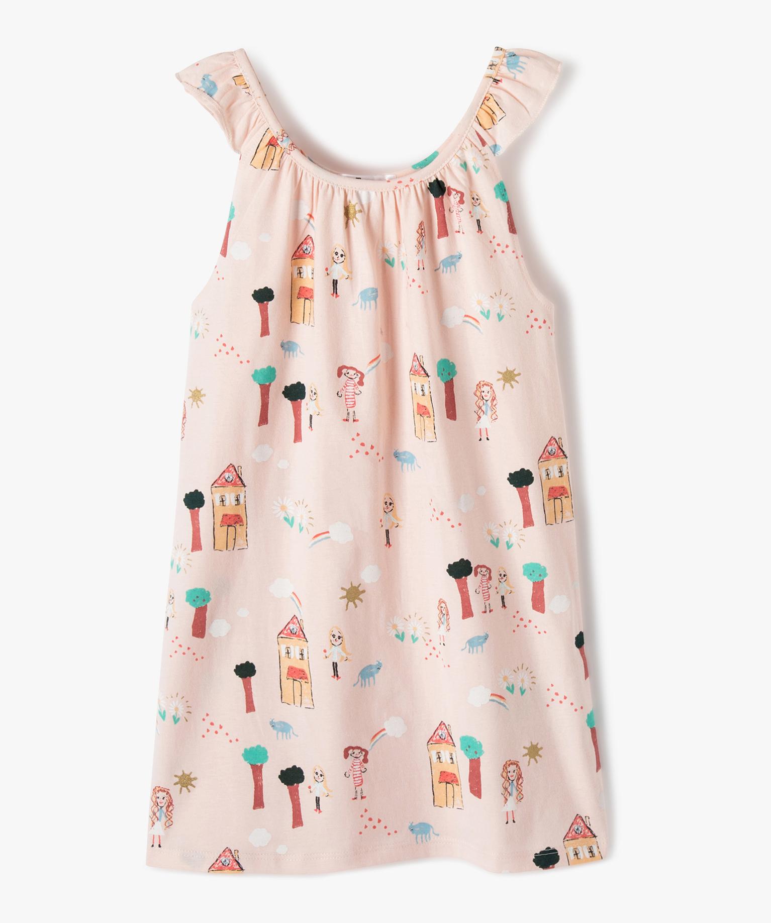 Une chemise de nuit sans manches qui se distingue par la simplicité de sa coupe. Ample et confortable, cette nuisette accompagne les enfants pour des nuits paisibles. Elle possède une encolure ronde avec petites fronces et de larges bretelles volantées. Cette chemise de nuit fille est parsemée de petits motifs dessinés et agrémentée de petites touches pailletées. Finitions surpiquées sur les bretelles. Col rond finition biais.