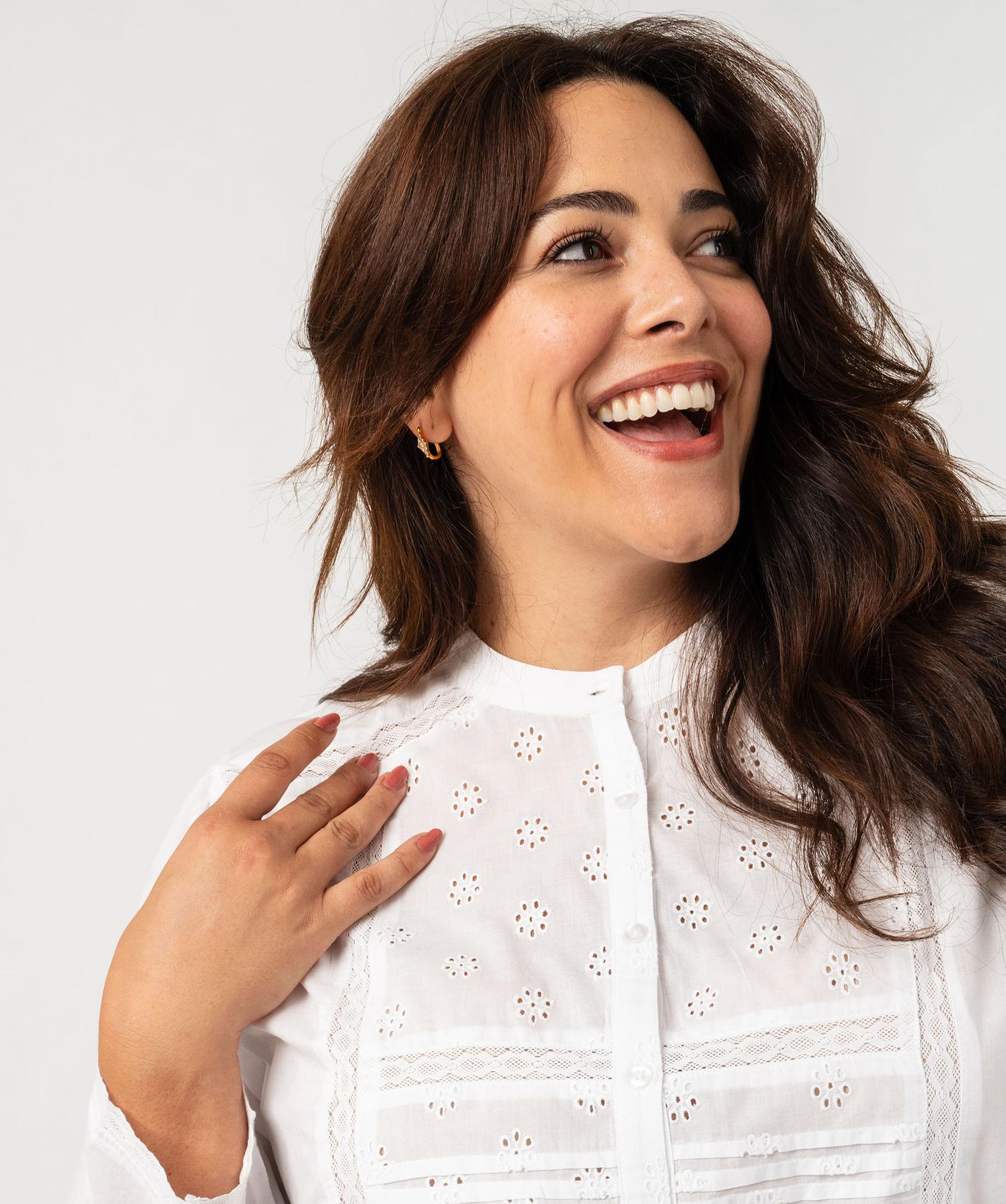 Vous allez succomber au charme romantique de cette chemise pour femme grande taille (du 46 au 54). Une chemise en coton agrémentée de broderie anglaise et de jolies bandelettes de dentelle sur l’avant offrant un bel effet de transparence. Cette chemise unie possède un col rond et de larges manches froncées sur les épaules avec poignets en dentelle, fermés par un bouton. Une chemise brodée à associer à une jupe longue pour un look boho très tendance. Fermeture par boutons aux reflets nacrés.