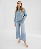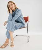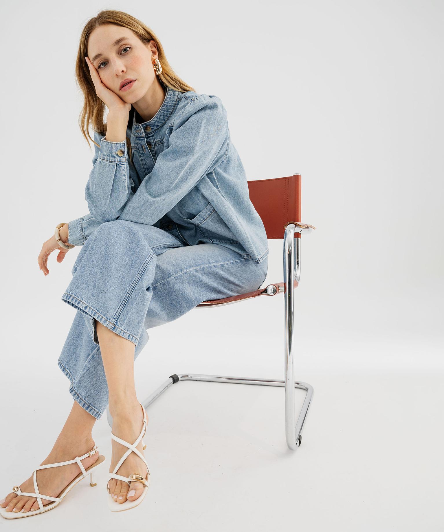 Gros coup de cœur pour cette chemise en jean qui possède la tenue d’une veste printanière tout en conservant le charme vaporeux d’une blouse d'artiste. Son col mao, ses fronces sur la poitrine, aux épaules et dans le dos, ainsi que ses manches longues bouffantes resserrées aux poignets donnent à cette chemise femme une silhouette pleine de romantisme et de caractère. Sa coupe trapèze généreuse et sa longueur aux hanches créent un tombé élégant, facile à glisser aussi dans un pantalon ou une jupe. Les grandes poches plaquées devant et les boutons imitation écaille ajoutent une note authentique. Une pièce modulable, facile à superposer et parfaite pour structurer les looks de saison.