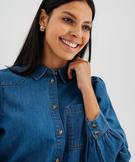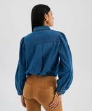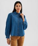 La chemise en jean revue et corrigée par LuluCastagnette ! Une chemise pour femme confectionnée dans une toile de coton souple et légère, très agréable à porter. Elle affiche de jolies surpiqûres contrastantes emblématiques du vestiaire denim. Les manches larges, froncées aux épaules et aux poignets, rendent ce chemisier particulièrement féminin. Ce modèle porte la signature de la marque à travers un logo métallique brodé sur la poche poitrine. Pli plat dans le dos.
