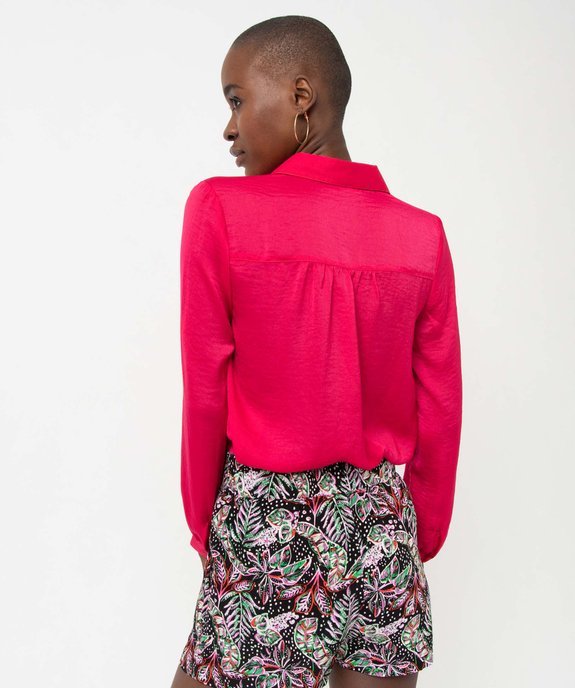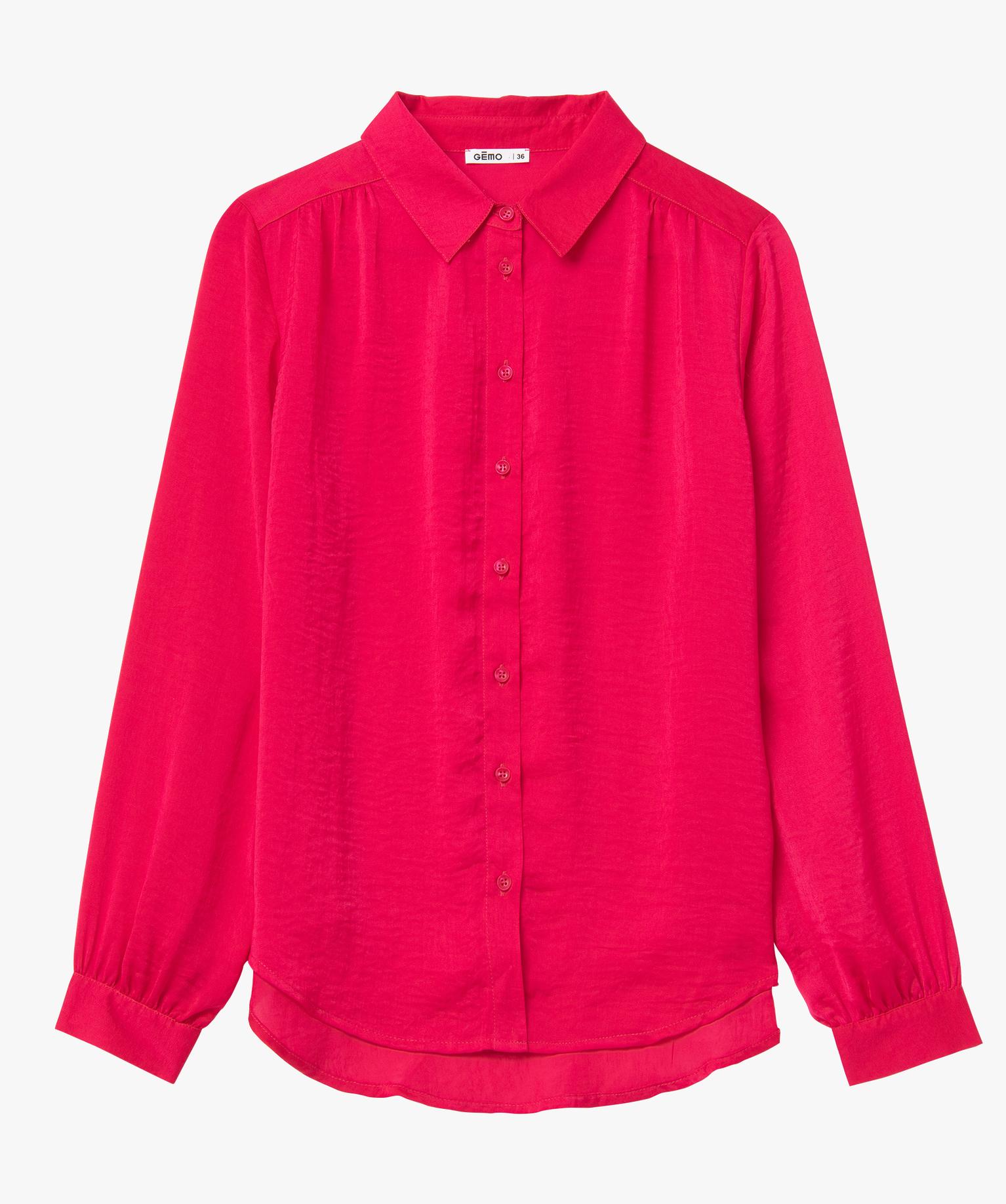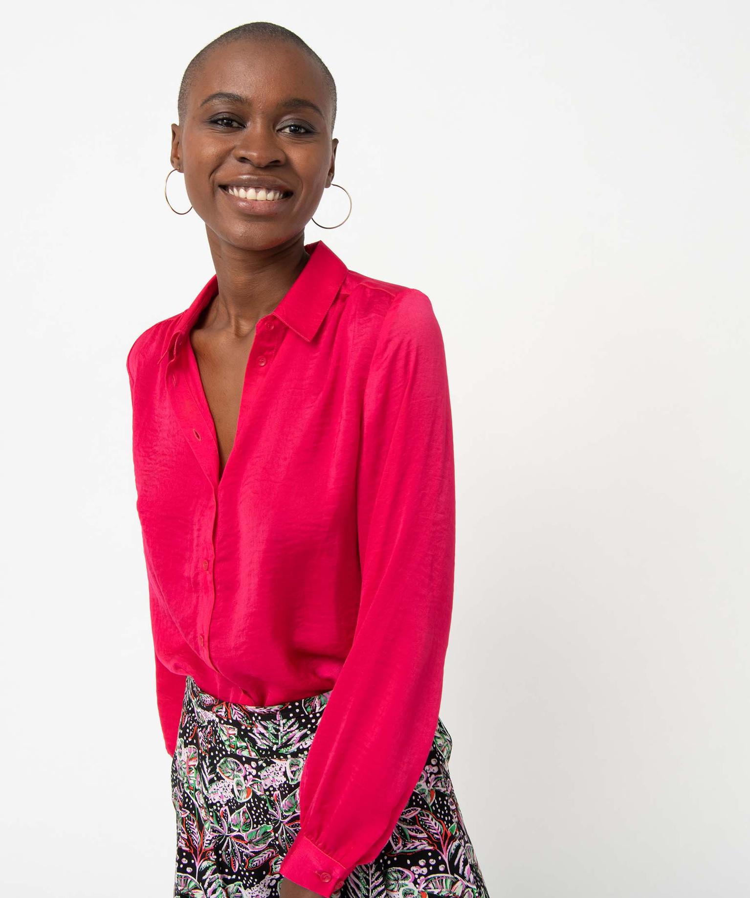 Ajoutez une touche de couleur pétillante à vos looks grâce à cette chemise à manches longues. Une chemise pour femme qui doit toute son élégance à sa matière satin fluide aux reflets soyeux. Cette blouse unie possède de larges manches resserrées aux poignets par un large biais ajustable par 2 petits boutons. De petites fronces sur l’avant des épaules et au milieu du dos assurent un maximum d’aisance. Cette chemise se ferme par boutons ton sur ton sur l’avant et se porte avec une jupe droite comme avec un jean. Bas arrondi.