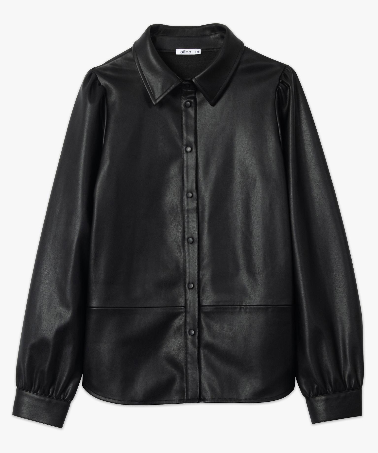 La traditionnelle chemise pour femme adopte un look atypique grâce à sa composition en matière synthétique imitation cuir. Une chemise à manches longues inspirée de la tendance rock, mais qui affiche des détails résolument féminins comme des fronces aux épaules et aux poignets, un bas arrondi et un pli plat dans le dos. Une chemise fermée par boutons pression, à porter fermée ou ouverte sur un tee-shirt.