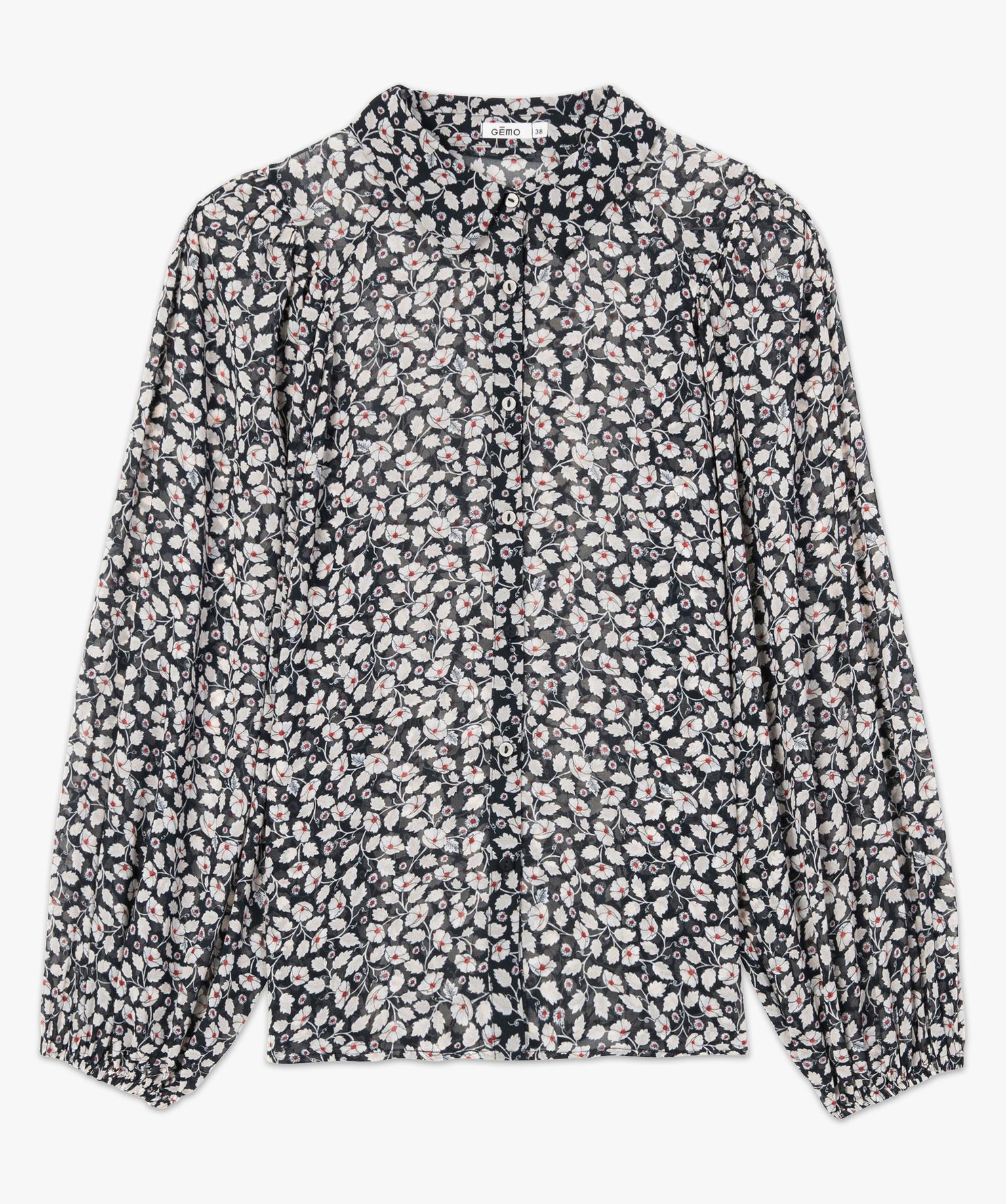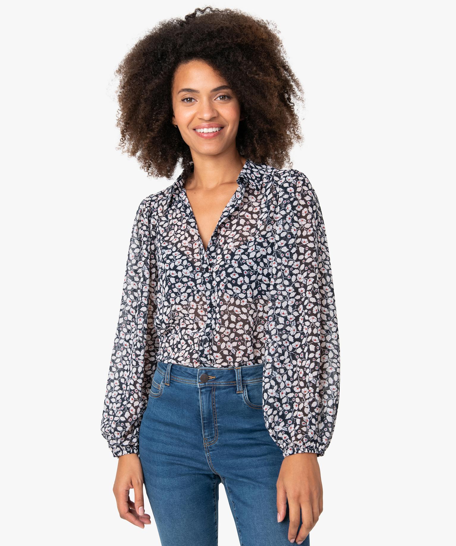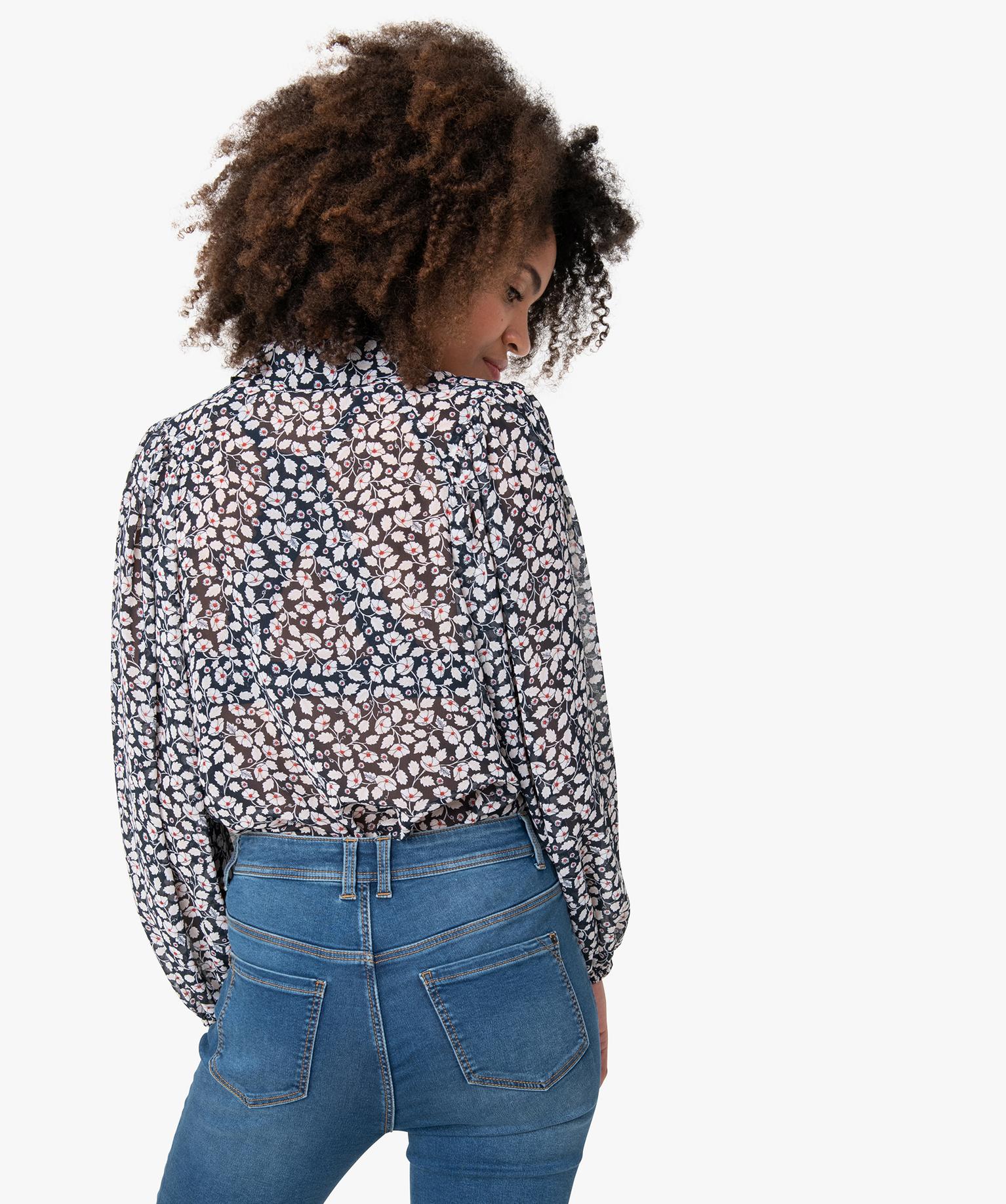 Article emprunté au vestiaire masculin, la chemise de pare de détails ultra féminins pour composer de nombreux looks pleins de charme. Cette chemise femme est composée d’un voile léger, légèrement transparent et parsemé de motifs fleuris pour une allure romantique et glamour. Elle possède des manches longues et larges avec poignets élastiqués et épaules froncées. Ses emmanchures raglan assurent une grande aisance de mouvements. Cette chemise fleurie se ferme sur l’avant par de petits boutons ton sur ton. Vous l’associerez à un pantalon en toile et une paire d’escarpins à talon.