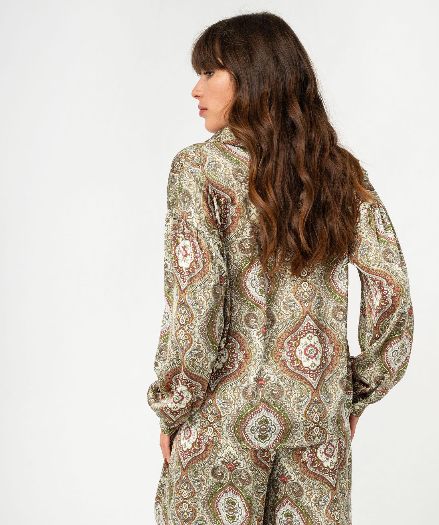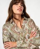 Ajoutez une touche ultra tendance à vos tenues avec cette chemise imprimée pour femme. Confectionnée en matière satinée fluide et confortable, elle offre d’élégants reflets. Ce chemisier au look singulier se marie aussi bien avec un jean qu’avec un pantalon large ou une jupe crayon. Les biais sont boutonnés aux poignets et le bas est arrondi.