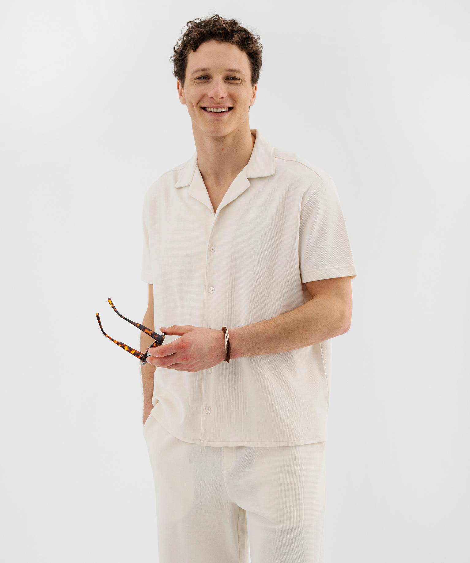 Chemise manches courtes à col cubain en maille piquée homme ecru