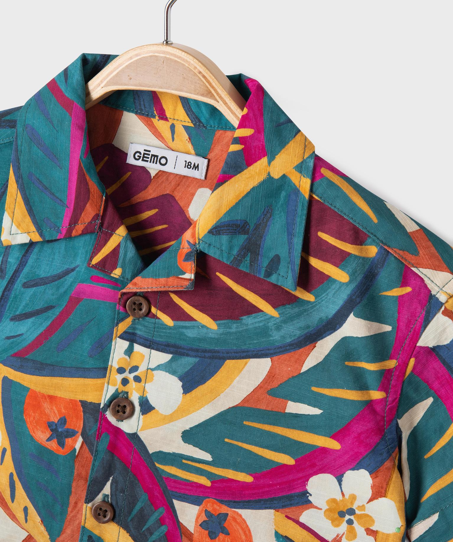Ajoutez de la couleur dans le vestiaire estival de votre bout de chou avec cette jolie chemise à motifs exotiques aux couleurs vives ! Une chemise bébé garçon dotée d’un col cubain, parfaite pour créer des looks décontractés pleins de bonne humeur. Confectionnée en coton tramé, elle offre au tout-petits douceur et allure authentique. Une chemise à manches courtes fermées par des petits boutons aspect bois.