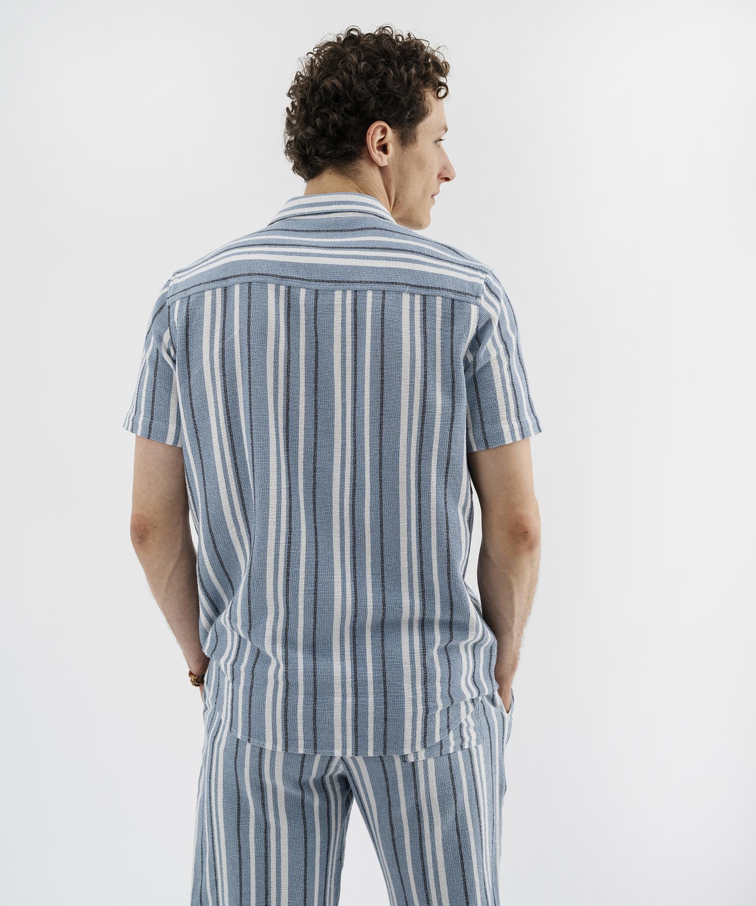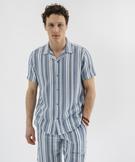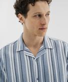 Chemise manches courtes col cubain en textile de coton tissé rayé homme bleu chine