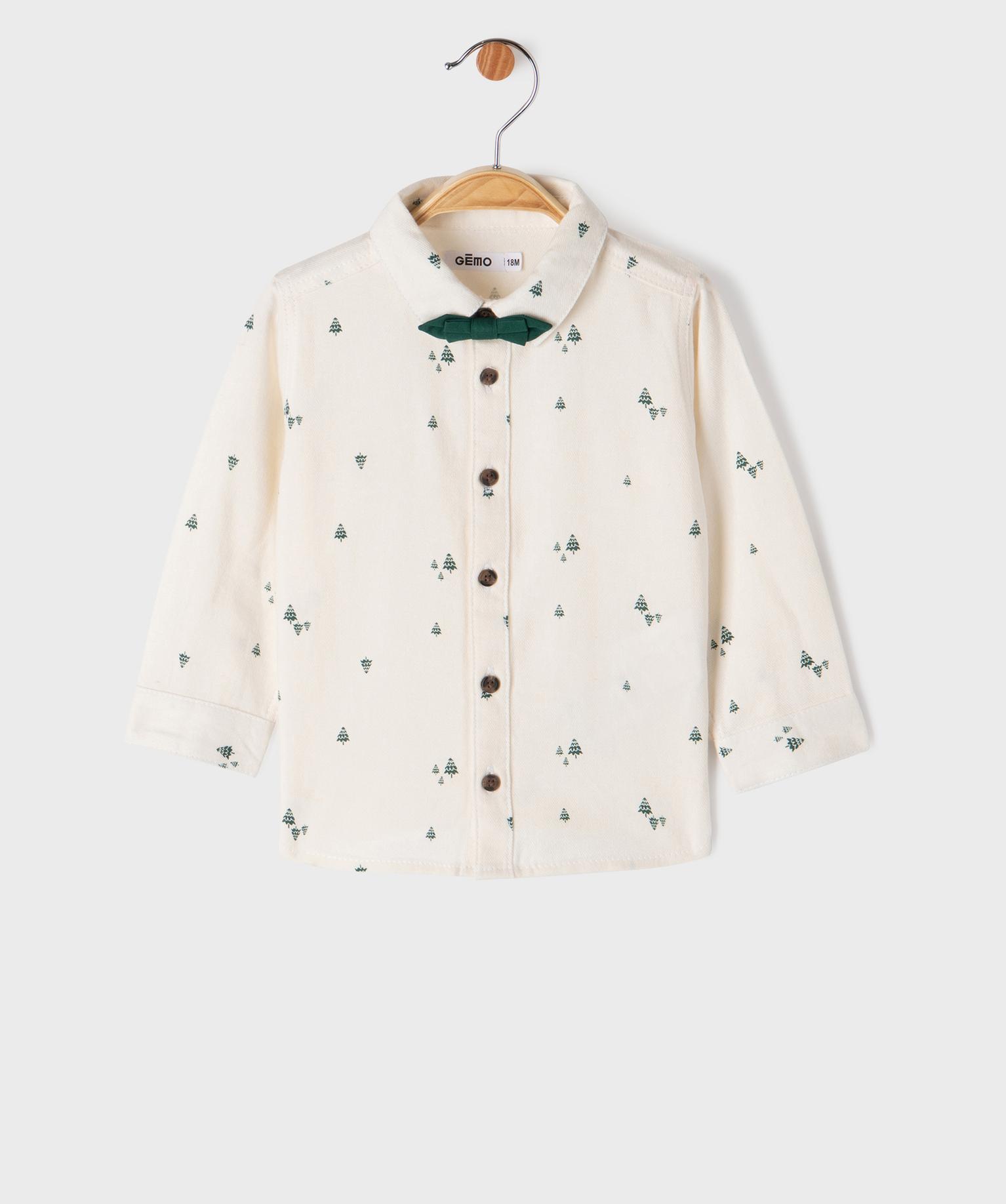Pour une tenue de fête chic ou un clin d'œil saisonnier au quotidien, habillez votre petit garçon de cette ravissante chemise pour bébé ! La chemise à manches longues est confectionnée dans une toile de coton sergée souple et douce, imprimée de petits sapins. Elle s'accompagne d'un élégant nœud papillon, amovible à l'aide d'un scratch à l'arrière. La chemise se ferme à l'aide d'une jolie boutonnière en écaille imitation. Poignets boutonnés. Coupe droite. Col classique. Base arrondie.