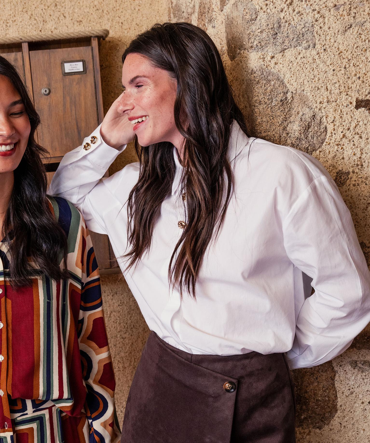 Redécouvrez la basique et indispensable chemise femme blanche avec une touche bijou qui change tout ! Sa coupe droite, son col classique et sa base arrondie en font un essentiel du dressing, facile à associer en toutes circonstances. Mais c’est sa boutonnière qui fait la différence : sous patte donc discrète sur toute la longueur, elle laisse apparaître sous le col trois gros boutons dorés, tel un pendentif ! Une note chic et inattendue qu’on retrouve aussi aux poignets, avec deux boutons assortis. 100 % coton, la chemise manches longues allie style, confort et raffinement.