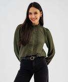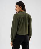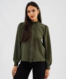 Chemise manches longues en maille texturée et dentelle femme kaki