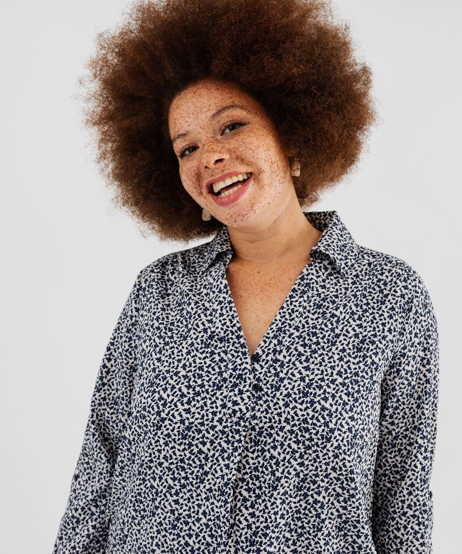 Laissez-vous charmer par cette superbe chemise légère, chic et décontractée à la fois. Ses manches longues se retroussent grâce à une patte boutonnée pour accentuer son côté cool. Sa matière fine, gaufrée et extensible, parsemée de petits motifs fleuris ajoutent une touche de romantisme à vos tenues. Cette chemise femme grande taille (46 au 54) offre légèreté et souplesse, assurant un confort optimal. Elle se marie facilement avec un jean brut pour un style casual, ou avec un pantalon en toile pour un look plus sophistiqué. Col chemise avec encolure V et 2 boutons. Fronces sur l'avant des épaules. Poignets 2 boutons. Coupe légèrement évasée. Base arrondie.
