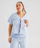 Cette chemise à rayures arbore une allure authentique aux accents romantiques. Confectionnée en coton, elle est particulièrement agréable à porter en plein été. Cette chemise pour femme grande taille (du 46 au 54) se distingue par sa coupe courte et sa fermeture par 3 liens à nouer sur l’avant. Elle se porte sur un top à bretelles ou sur un haut de maillot de bain. Elle possède un joli décolleté en V et des pinces poitrine qui subliment le buste. Une chemise à manches courtes à porter avec le pantalon assorti ou avec un pantalon uni.