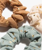 Un lot de 3 chouchous pour les cheveux en gaze de coton ornés de petits pois scintillants. Des accessoires de coiffure fille qui permettront la création de queues de cheval, de chignons et de couettes. Ce lot se compose de 3 élastiques cheveux de couleurs différentes à porter ensemble ou séparément.