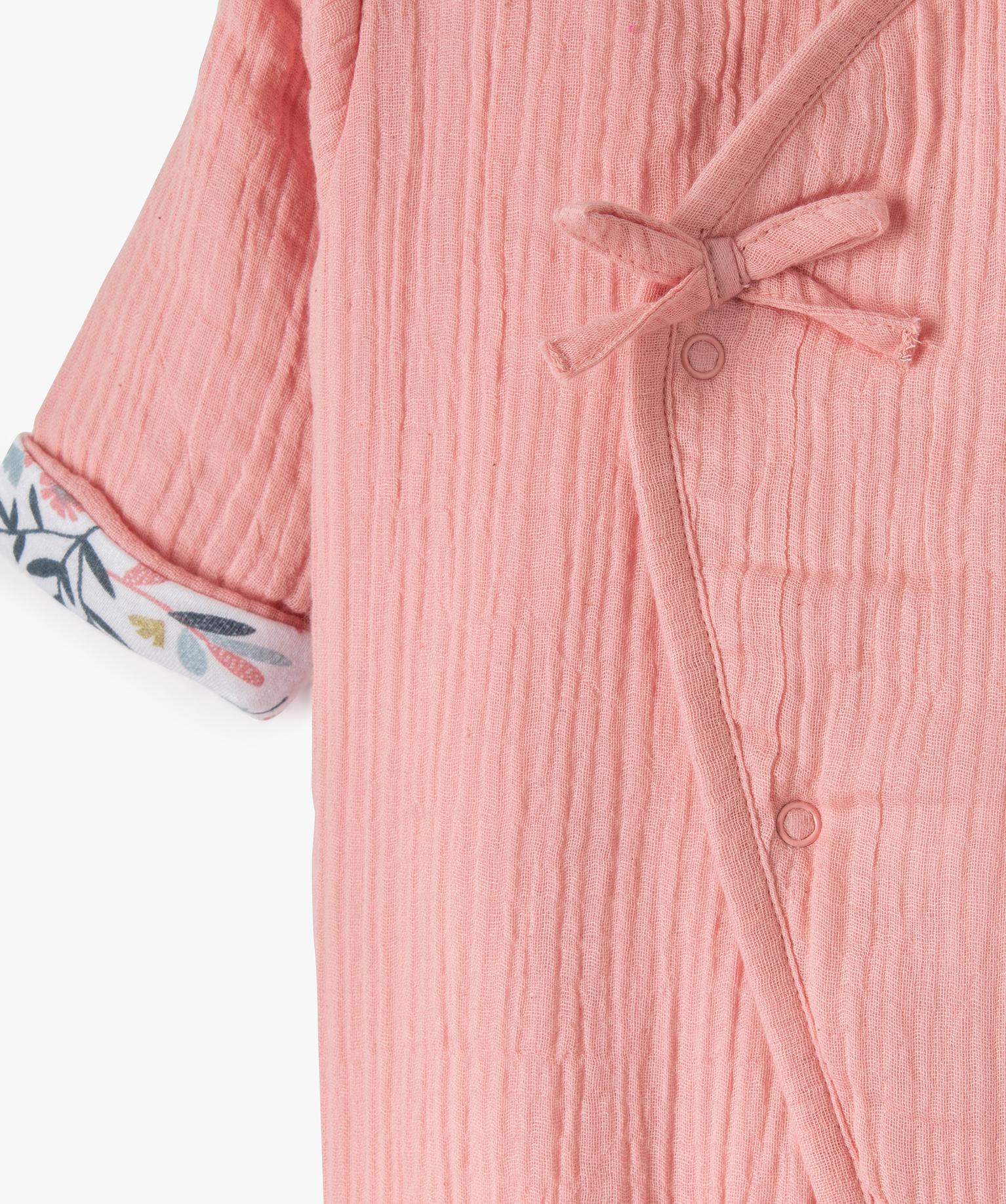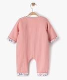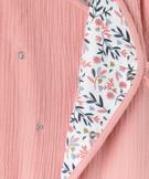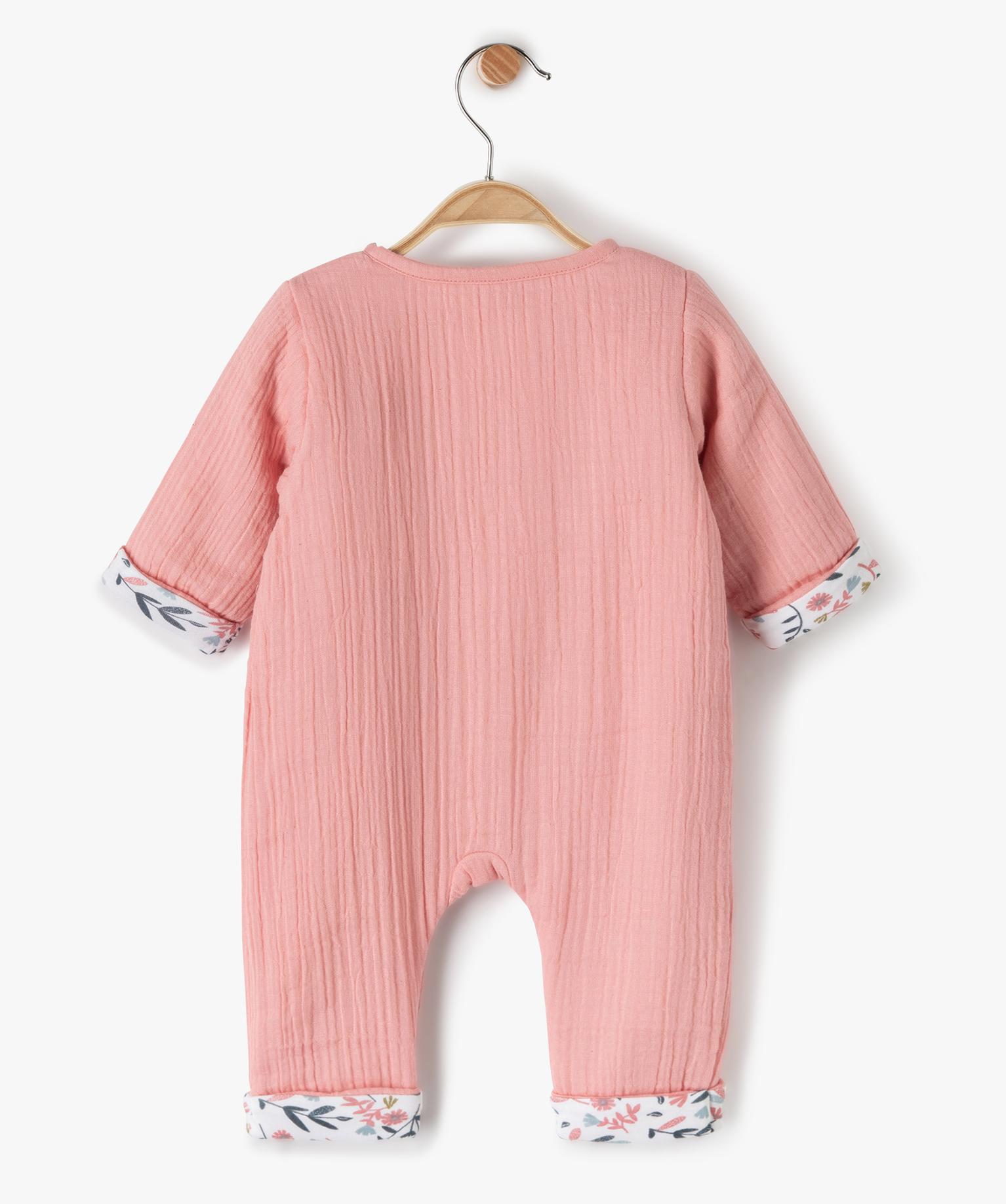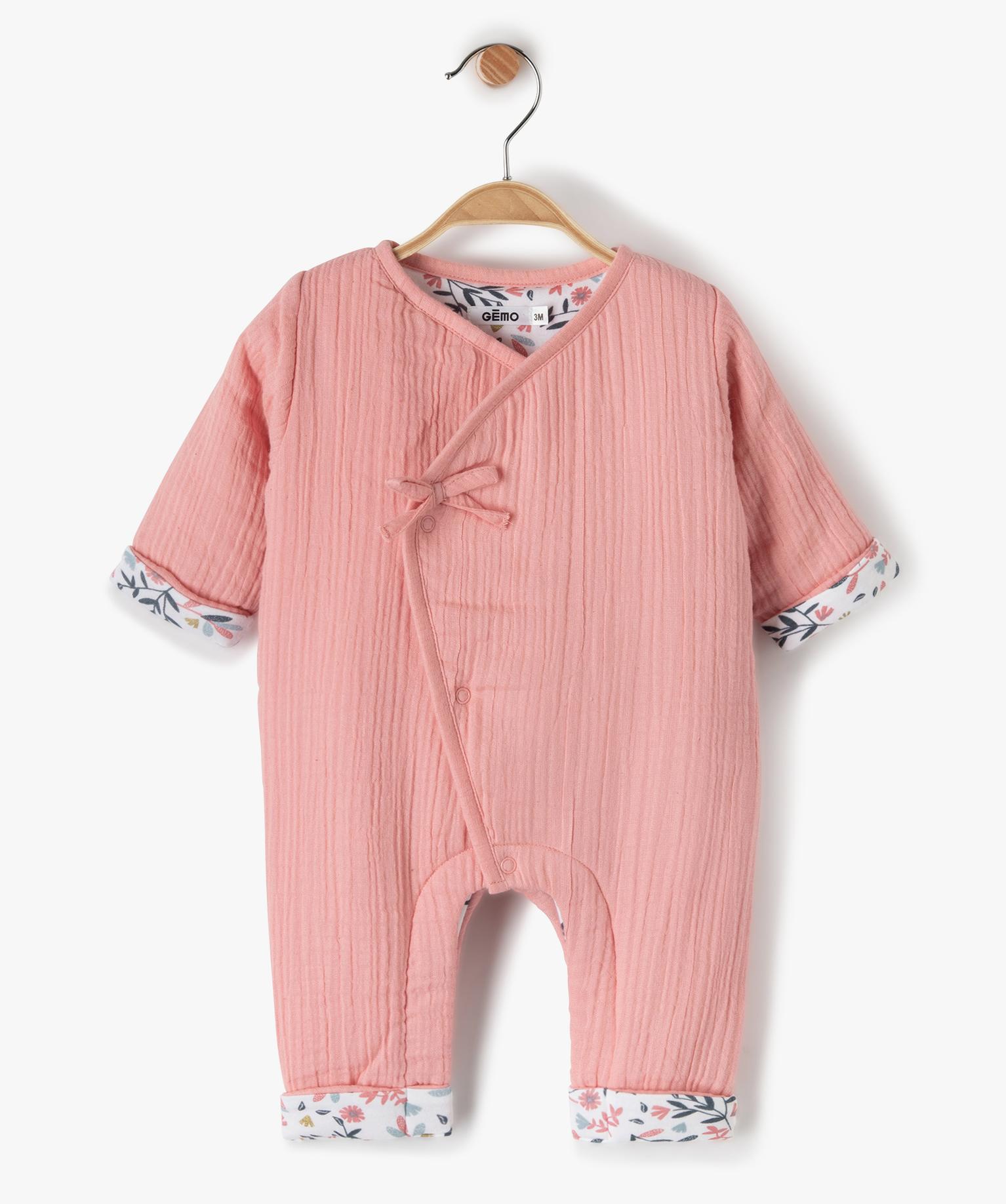 Tendance, la gaze de coton se décline ici dans une combinaison bébé absolument adorable. Légèrement froissée, elle affiche un coloris pastel tout deux, animé en doublure par un motif floral. Chaude, cette combinaison longue est finement rembourrée. Pratique, elle s'ouvre par l'avant et à l'entrejambe en un tour de main, grâce à ses boutons-pressions. Élégante et confortable, cette jolie combinaison peut être portée au quotidien, ou également comme pyjama sans pieds. Petit nœud sur l'avant. Revers cousus aux poignets et aux chevilles.