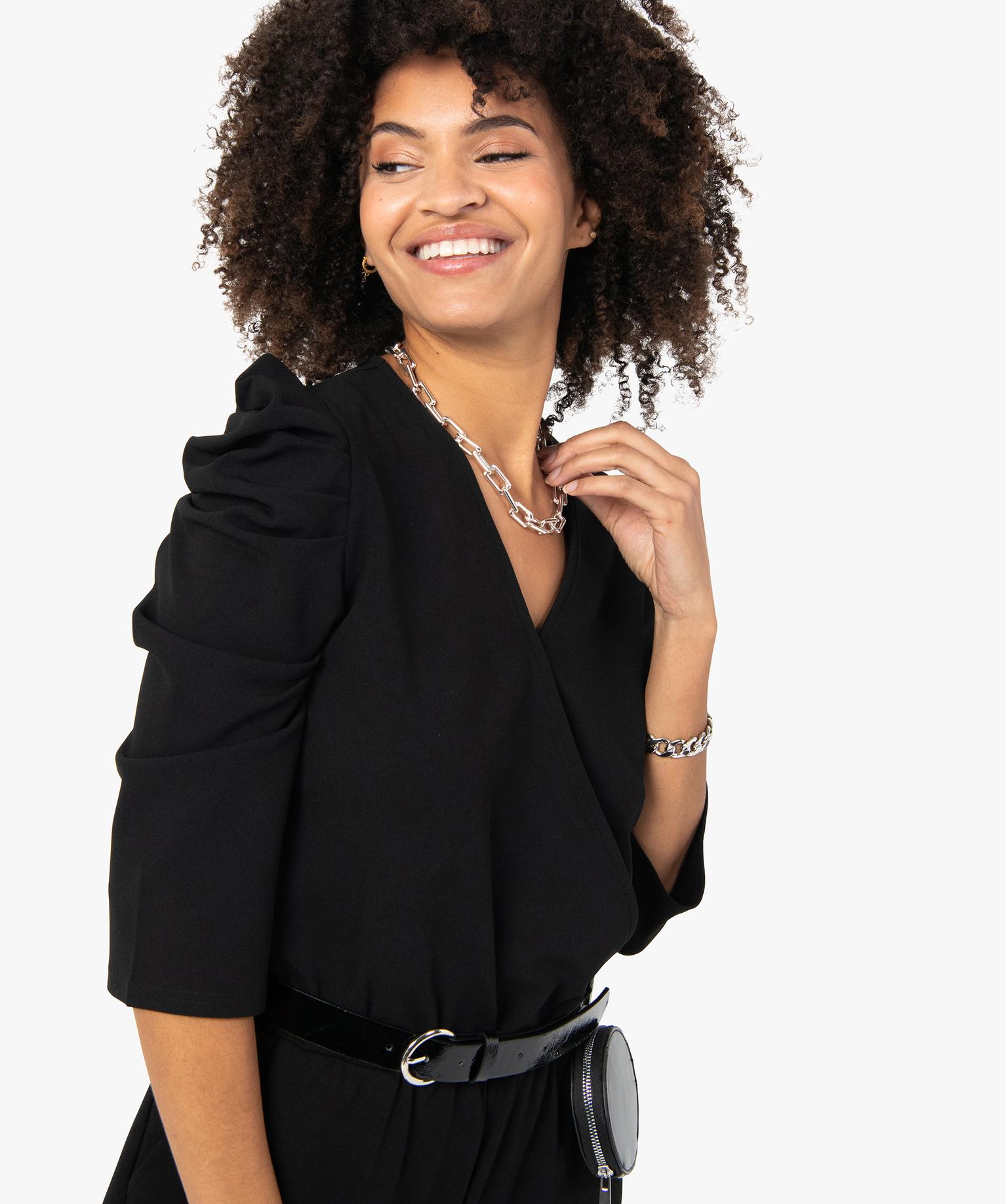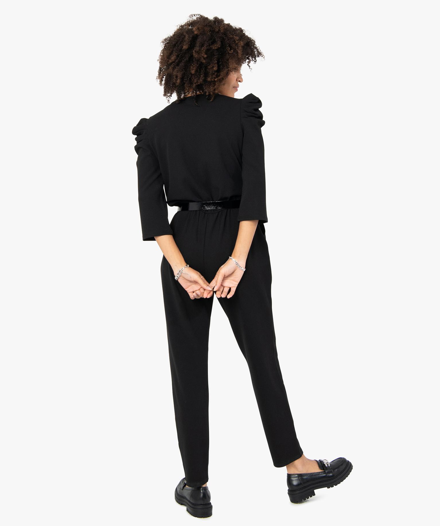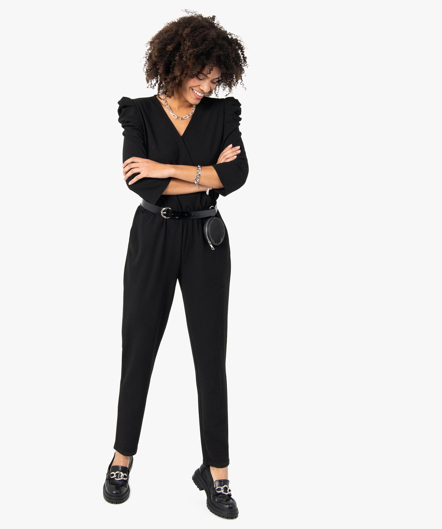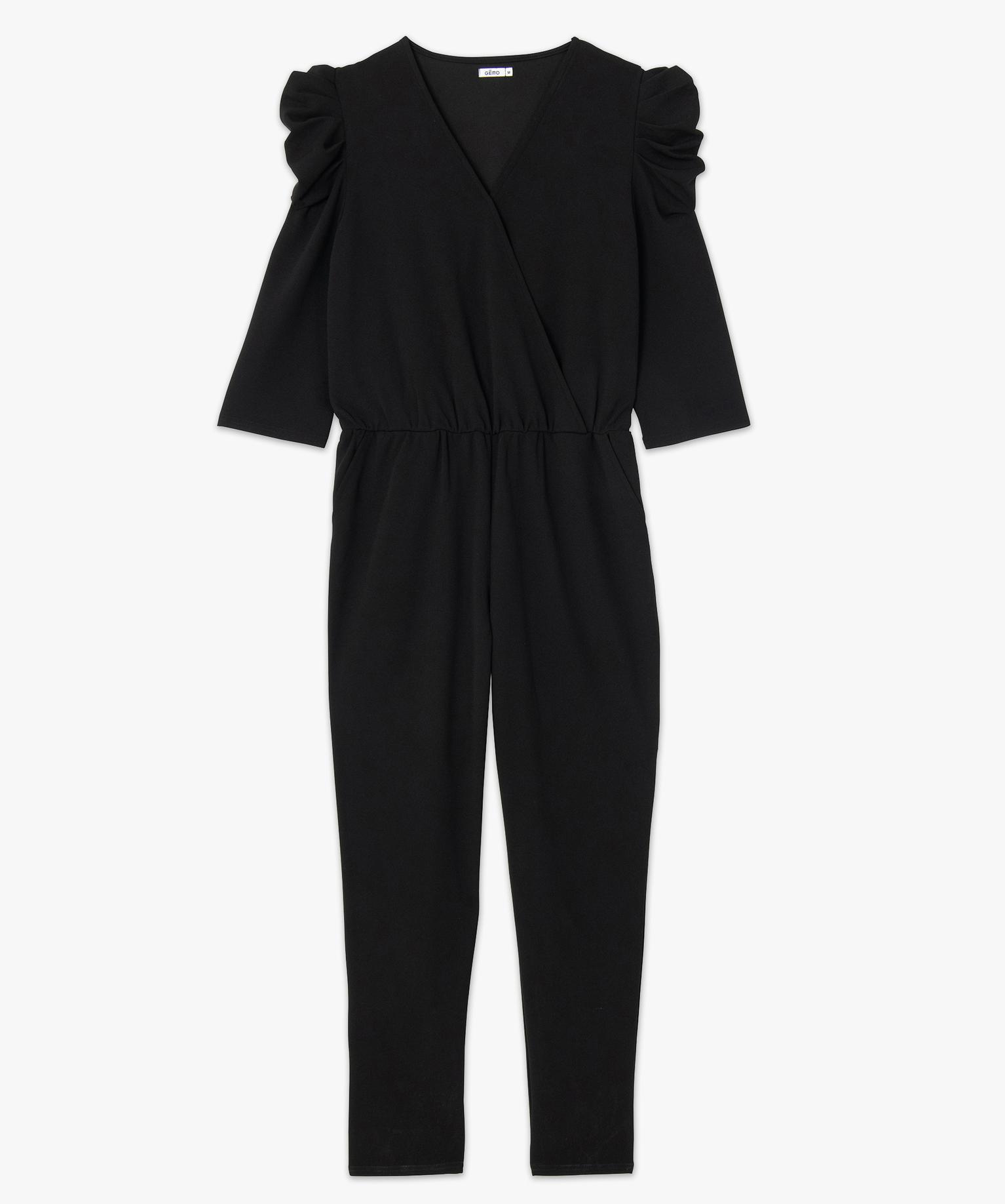Une version ultra chic de la combinaison pour femme. Une combinaison pantalon qui doit son allure festive à ses manches longues aux épaules froncées créant un effet bouffant. Elle possède un haut cache-cœur fermé par un bouton pression invisible, une ceinture élastiquée et un pantalon ample avec deux poches latérales. Cette combinaison élégante est confectionnée dans une matière aspect crêpe extensible très confortable. Elle se porte avec des escarpins à talon.