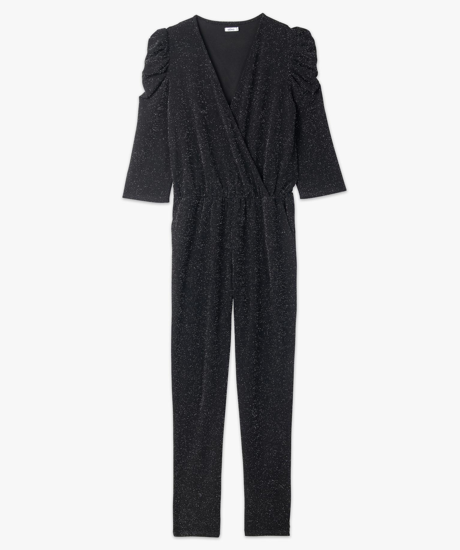 Pour toutes vos soirées festives, optez pour le confort de la combinaison pantalon. Cette combinaison femme s’affiche dans une matière pailletée qui vous assure un look ultra féminin. Pour accentuer l’esprit glamour, cette combinaison pailletée possède des manches longues avec épaules bouffantes et un haut cache-cœur fermé par un discret bouton pression. Elle possède une taille élastiquée pour un habillage facile et un excellent confort. Une combinaison de soirée à porter avec des escarpins à talon pour les fêtes de fin d’année ! 2 poches.