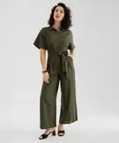 Combinaison pantalon inspiration saharienne en lin et viscose femme kaki fonce