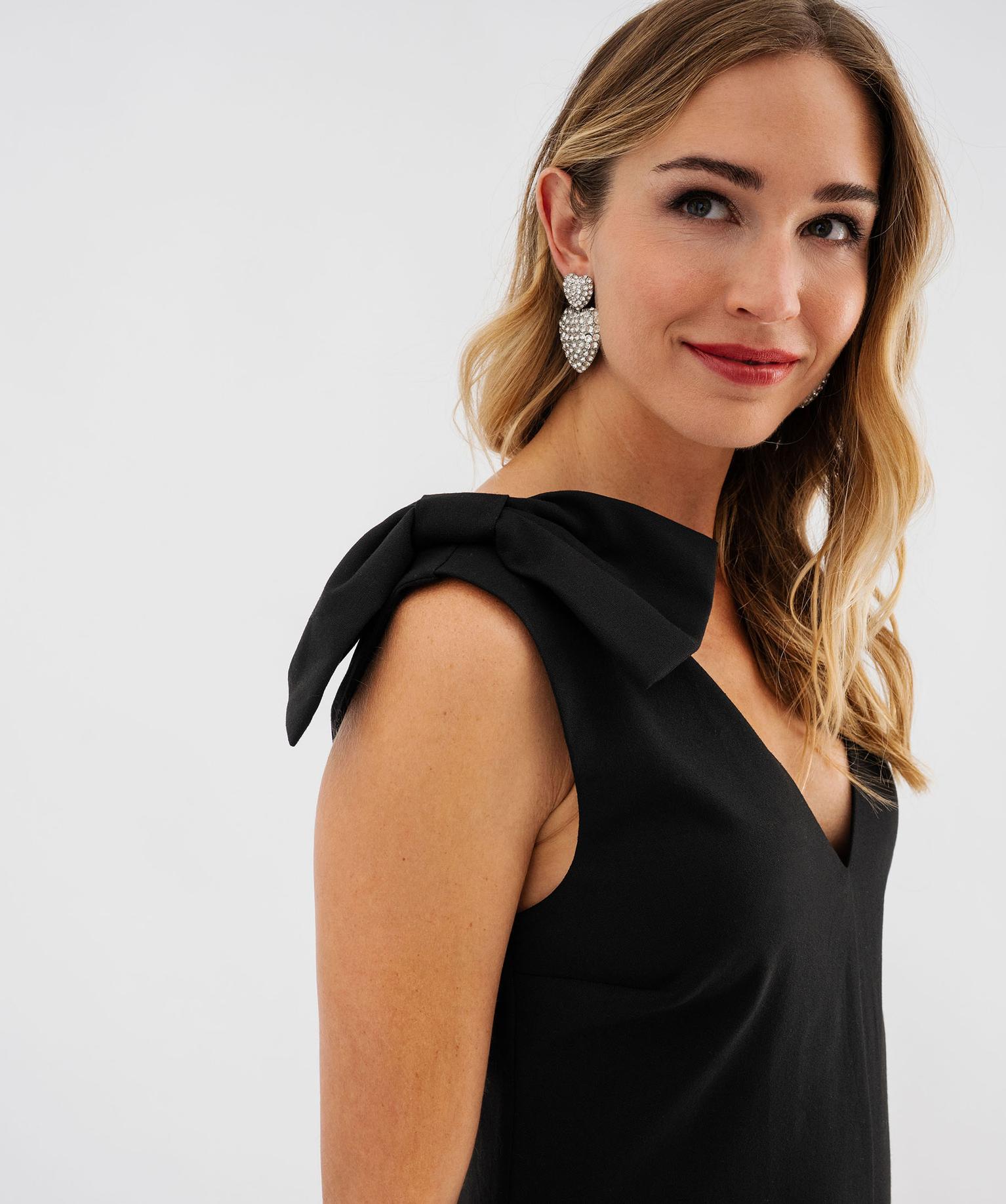 Cette combinaison pantalon pour femme est une pièce élégante et pleine de caractère, parfaite pour les grandes occasions ou pour mettre du chic dans votre quotidien ! Portée seule, elle remplace aisément une robe de soirée grâce à sa coupe flatteuse et sa matière souple légèrement extensible qui sublime la silhouette. Sans manches, la combi-pantalon se distingue par de gros nœuds assortis sur les épaules et une encolure en V racée, devant comme au dos. Ajustée à la poitrine, sa jambe large allonge la ligne avec allure. Fermeture par zip invisible sur le côté. Pour une touche de sophistication, associez-la à un blazer structuré et des escarpins. Pour une allure plus décontractée, une veste en toile et des chaussures plates comme des derbies ou des tennis suffisent à parfaire le look.