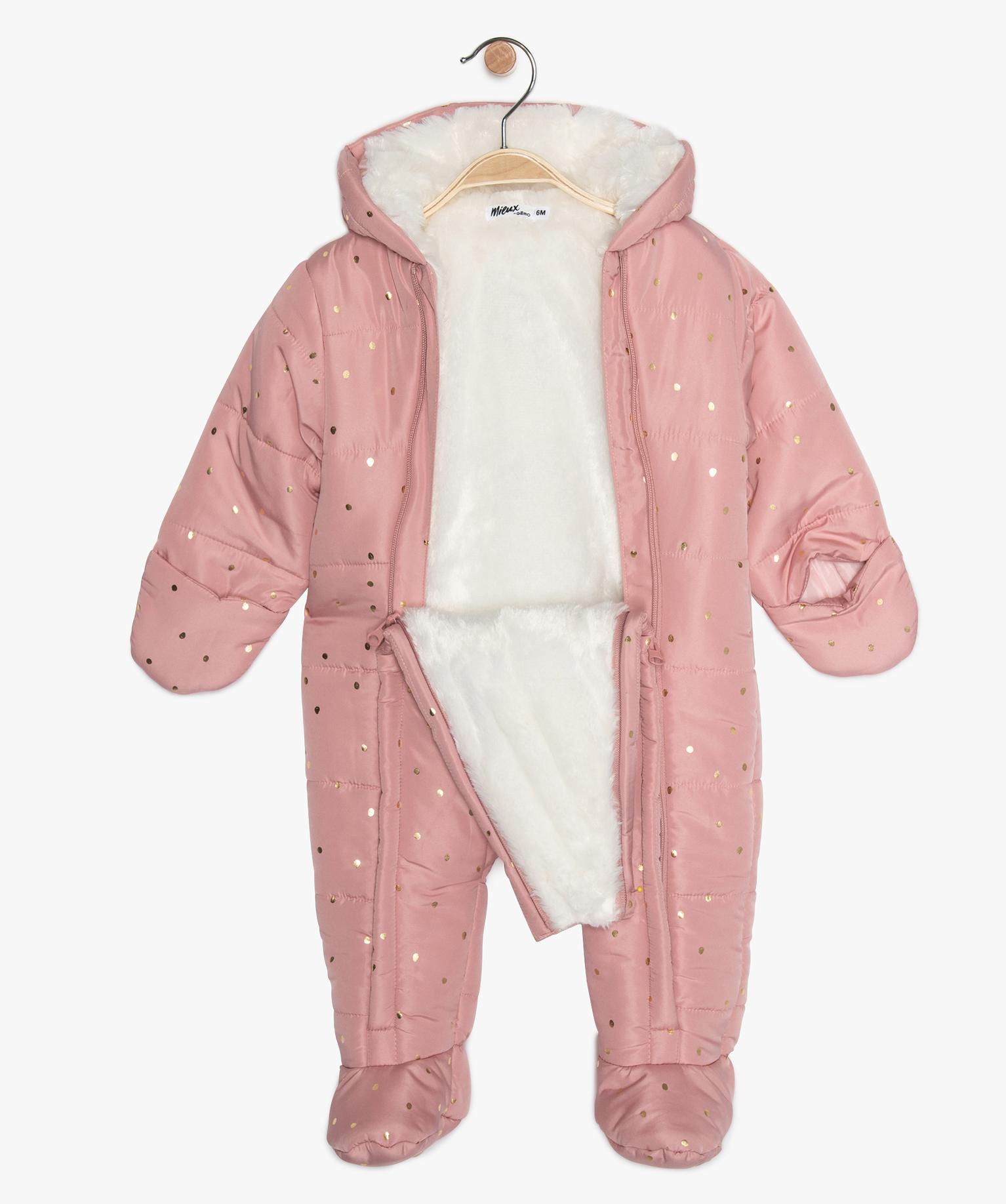 Une magnifique combinaison pilote qui permettra à votre petite fille de passer un hiver bien au chaud. Une combinaison bébé filleentièrement doublée d’une matière peluche ultra douce et ornée de petits motifs pailletés. Elle s’ouvre par deux zips sur l’avant permettant une ouverture totale et facilitant l’installation facile de bébé. Cette combinaison matelassée possède des moufles intégrées, astucieux pour garder les petites mains au chaud ! Cette jolie combinaison à capuche possède un rembourrage composé de fibres recyclées, pour un meilleur respect de la planète !