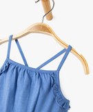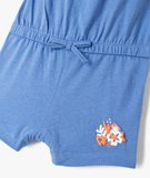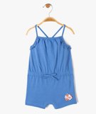 Votre fillette sera à croquer dans ce combishort en maille ! Une combishort bébé fille orné de petits volants aux emmanchures et dans le dos. Confectionné dans un jersey de coton flammé, souple et léger, il offre beaucoup de confort et reste agréable à porter même lorsqu’il fait très chaud. Cette combinaison courte présente de fines bretelles avec dos nageur, une taille élastiquée décorée d'un petit nœud et un entrejambe pressionné pour faciliter l'habillage. Un petit motif fleuri en gomme en relief en bas de jambe apporte de la couleur.