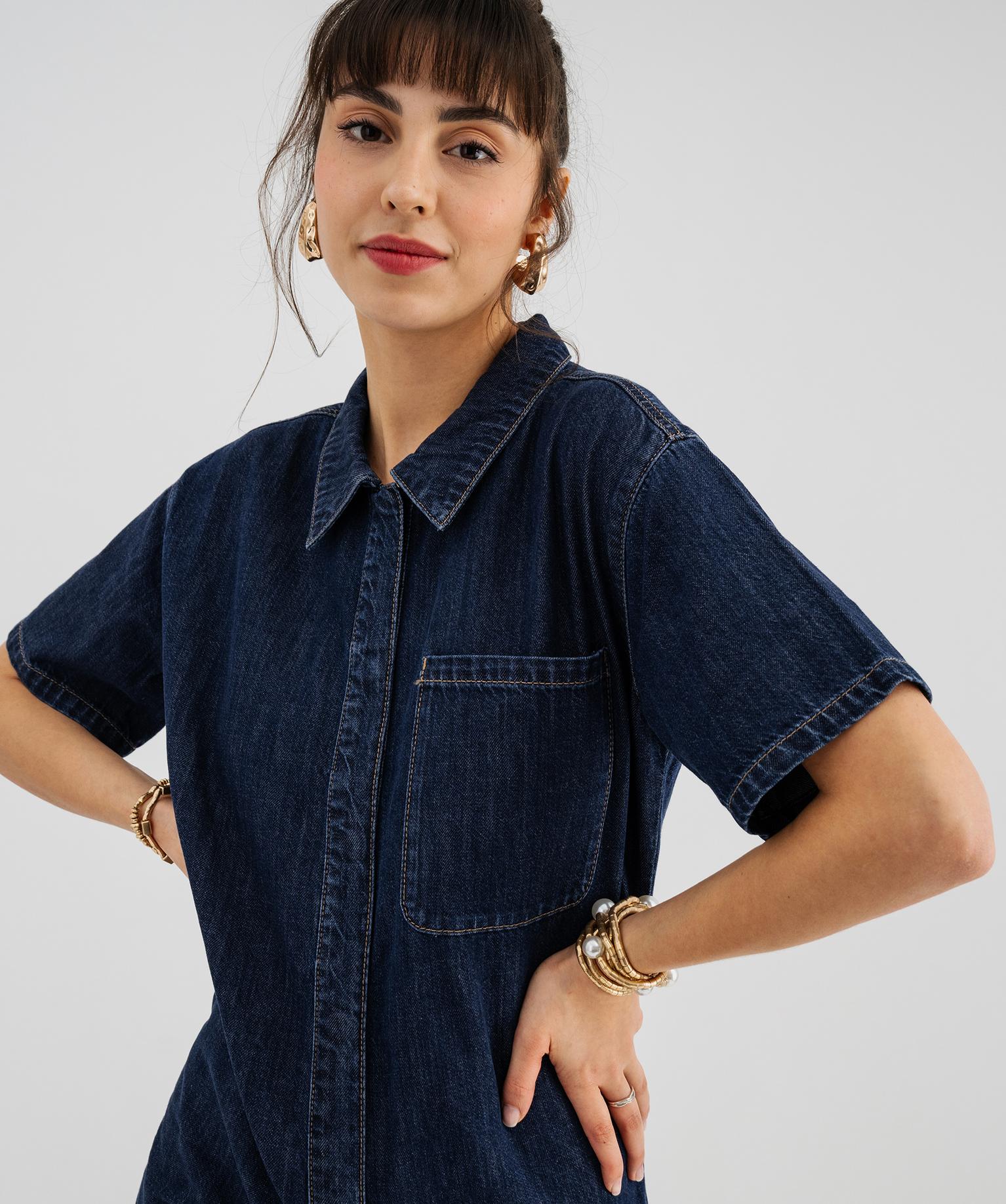 Combishort en jean manches courtes coupe loose femme bleu fonce