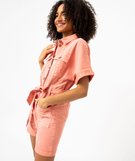 Pour une allure casual au top de la mode, optez pour ce combishort en toile denim colorée. Un combishort saharienne avec col chemise, deux poches à rabat sur la poitrine et deux poches plaquées sur les cuisses. Ce combishort femme possède une taille élastiquée au dos et une ceinture ton sur ton à nouer, il se ferme grâce à de gros boutons contrastants. Ce combishort à manches courtes possèdes des revers cousus et de larges emmanchures sans coutures pour un effet loose très tendance. Il se porte avec des sandales ou des derbies.