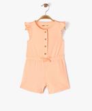 Un craquant combishort à ajouter au vestiaire estival des fillettes. En jersey 100% coton souple décliné en une belle couleur vibrante ou imprimé de motifs chatoyants, il est parfait pour les beaux jours. Le combishort bébé fille sans manches présente des volants aux épaules, une taille élastiquée avec un nœud décoratif et une boutonnière sur l'avant. Son col rond est souligné d'un biais uni assorti. À porter avec des sandales ou des tennis en toile.