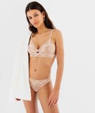 Cette culotte en dentelle, rehaussée de détails scintillants, allie confort et élégance avec brio. Sa dentelle extensible procure une sensation de douceur incomparable, tout en offrant une subtile transparence qui sublime votre silhouette. La ceinture élastique est délicatement ornée d'une finition dentelée et d'un petit nœud assorti, ajoutant une touche de charme. Grâce à ses finitions sans coutures au dos, cette culotte femme passera quasiment inaperçue sous vos vêtements. Associez-la au soutien-gorge assorti pour créer un ensemble romantique et élégant.