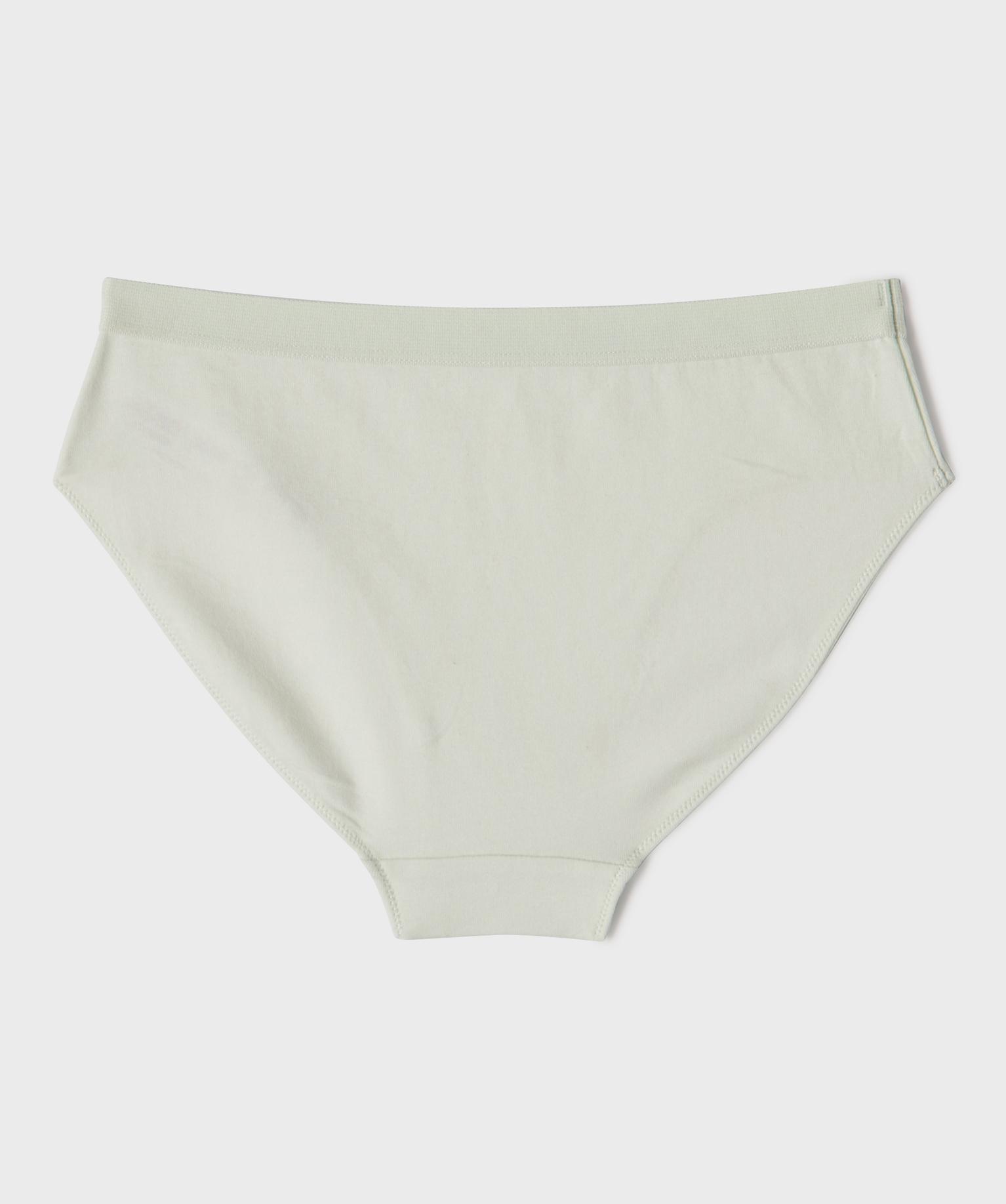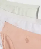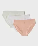 Lot de 3 culottes pour fille à petit motif discret. Le lot comprend 1 culotte blanche avec un petit soleil sur l'avant, 1 culotte colorée autre avec une petite fleur, et 1 autre également colorée avec l'inscription "Joli soleil". Les culottes sont confectionnées en coton biologique extensible, avec un élastique plat et doux à la taille, et un fond doublé coton. Idéales pour le confort et le maintien au quotidien.