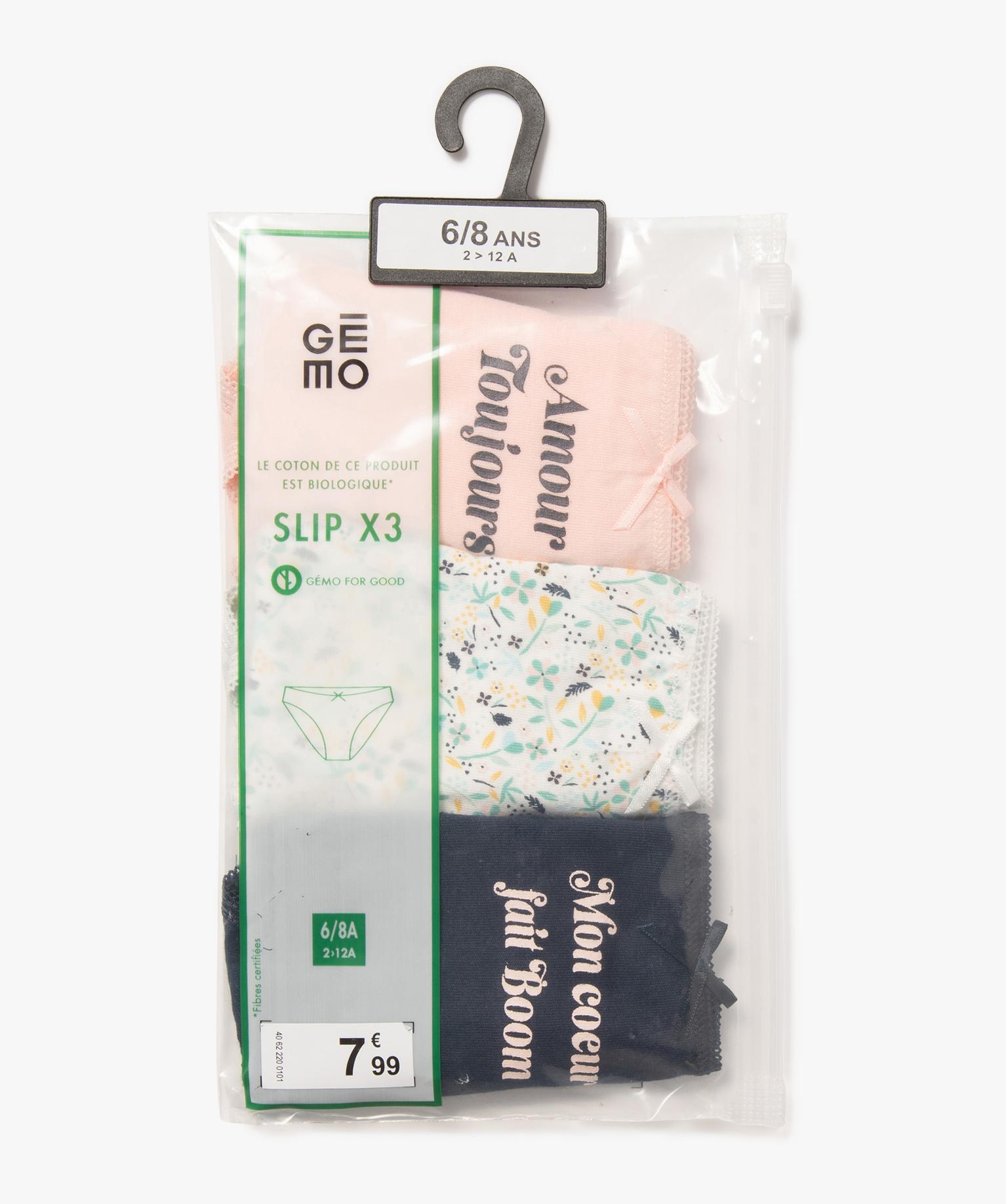Ce lot de culottes ornées de messages d’amour et de motifs fleuris saura séduire les petites modeuses en apportant une touche romantique à leur collection de sous-vêtements. Des culottes fille en coton extensible aussi élégantes que confortables avec élastique festonné à la taille et petit nœud satiné. Le lot comprend 2 slips avec message et 1 à motif floral.