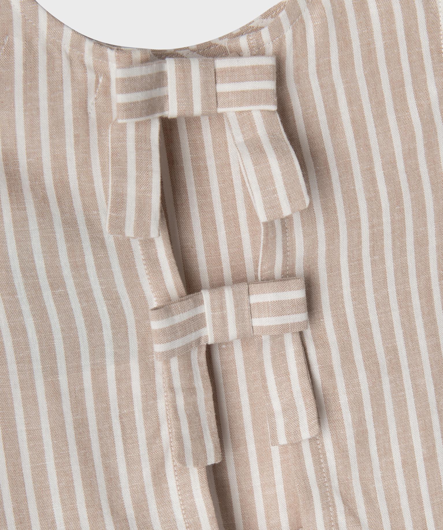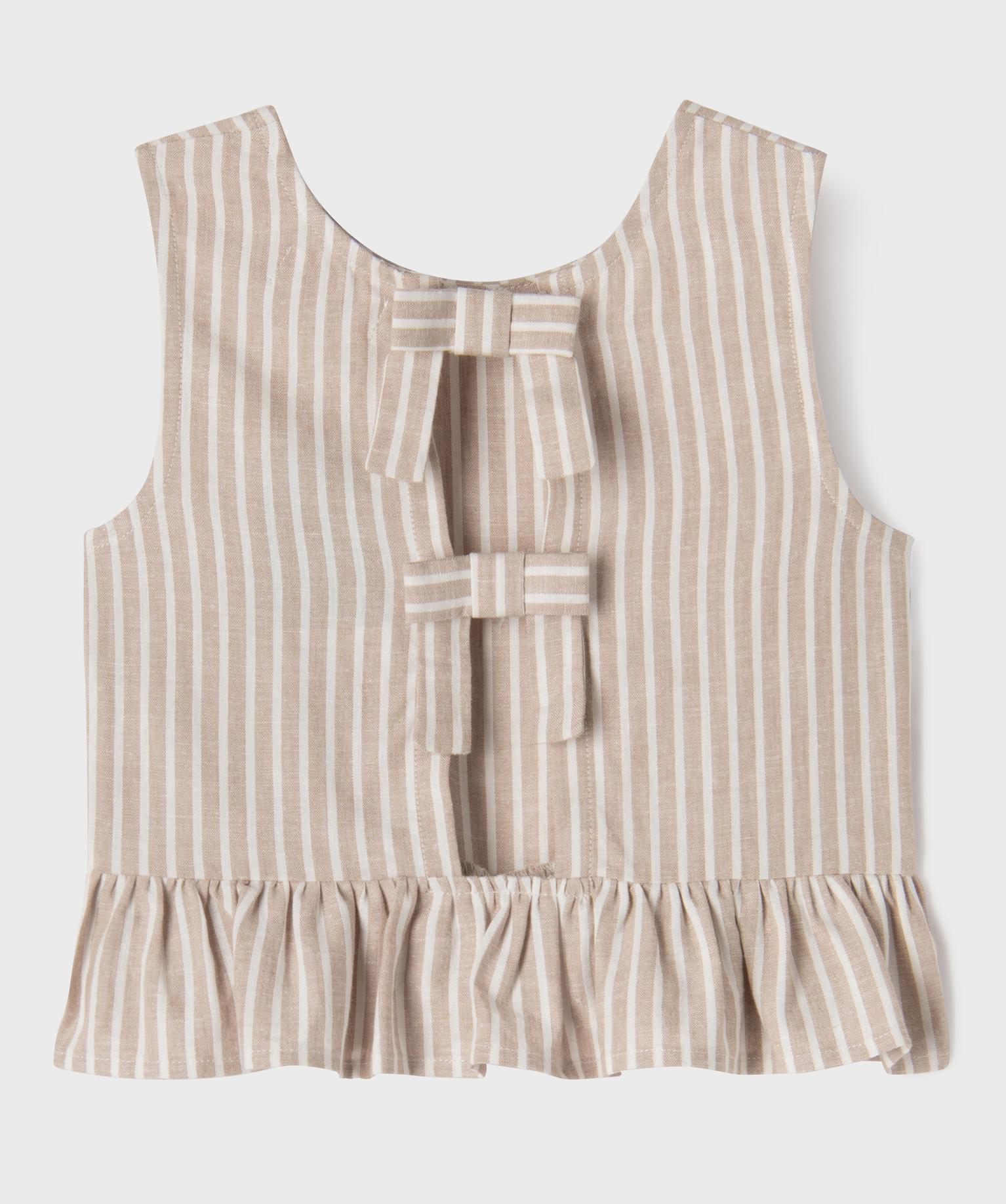 Ce débardeur fille en lin et viscose rayé est une véritable pépite de mode. Si l'avant reste sobre avec son col rond, le dos révèle une fantaisie irrésistible : un jeu de pans ouverts maintenus par deux nœuds délicats et la basque volumineuse. Pour faciliter l'enfilage, un bouton-pression discret est caché sous le nœud supérieur. Un haut aérien, graphique et féminin, parfaite pour sublimer les tenues de vacances ou de cérémonie avec une touche d'originalité.
