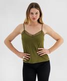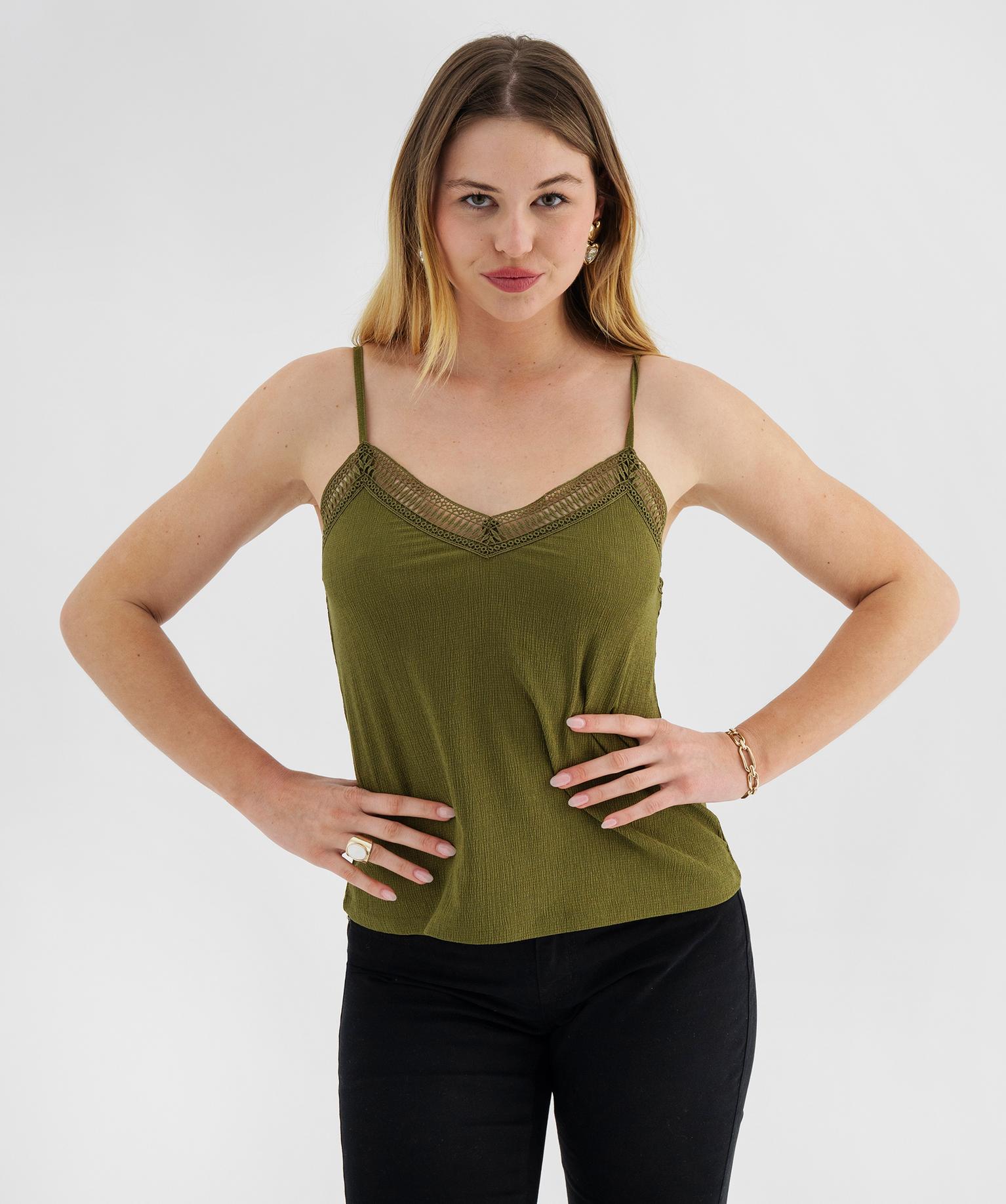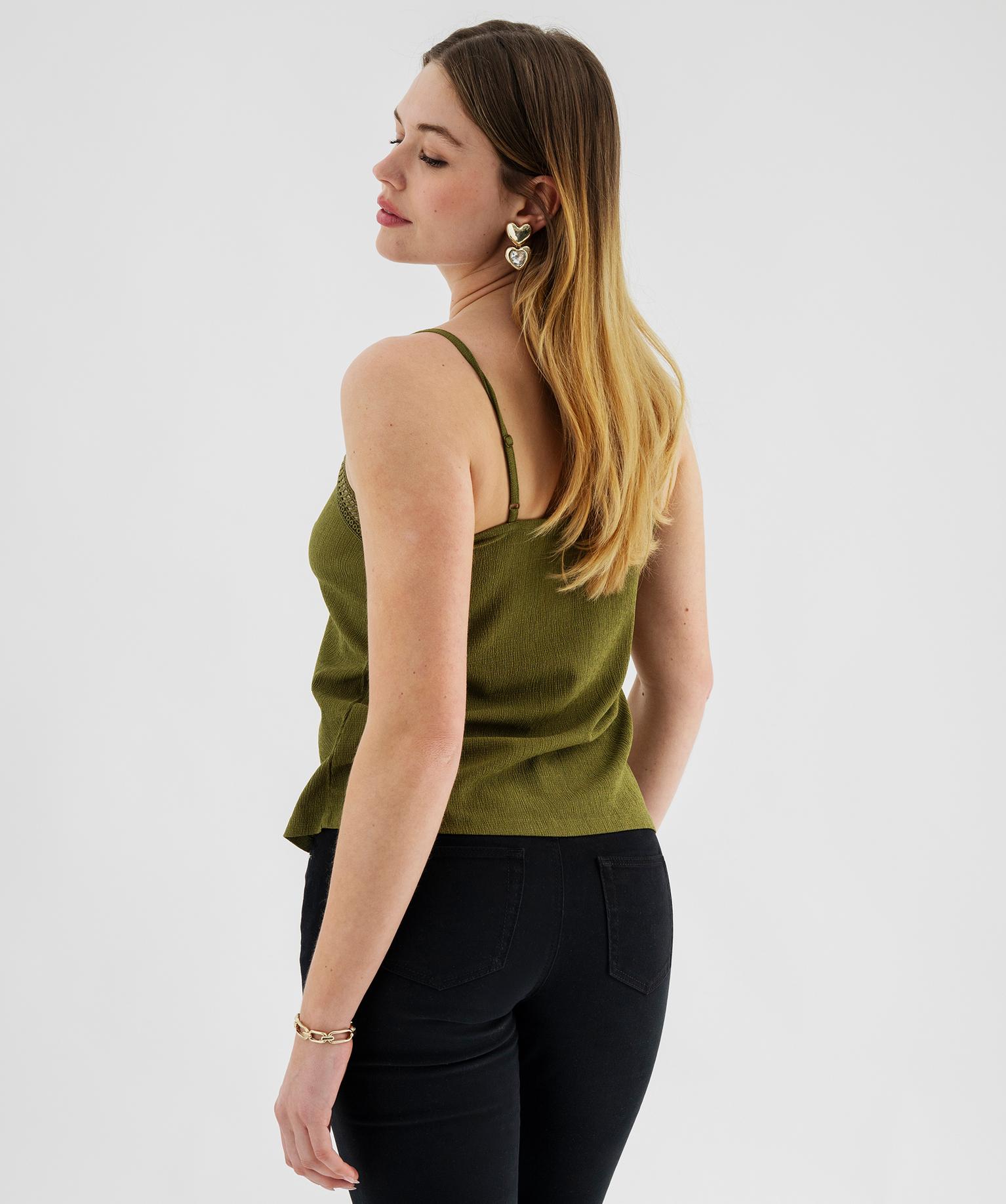 Débardeur à fines bretelles en maille texturée et broderies femme kaki