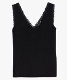 Un très joli débardeur pour femme confectionné en viscose ultra douce. Sa large encolure en forme de V met le décolleté en valeur. L’encolure et les bretelles sont bordées d’une fine bande de dentelle ton sur ton. Un débardeur col V à porter en soirée avec une jupe et des escarpins à talon ou avec un jean et une veste de tailleur.