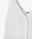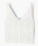 Cet élégant débardeur fille offrira aux ados une allure romantique aux accents bohème. Tricoté dans une maille ajourée inspiré du macramé, ce crop-top offre un joli jeu de transparence. Il possède un décolleté en V sur l’avant et carré dans le dos, qui sublime le buste. Ce débardeur ajouré se ferme par une rangée de boutons aux reflets nacrés. Il se porte avec une jupe longue et des sandales plates pour un look 100% bohème, mais aussi avec un jean ample taille haute.
