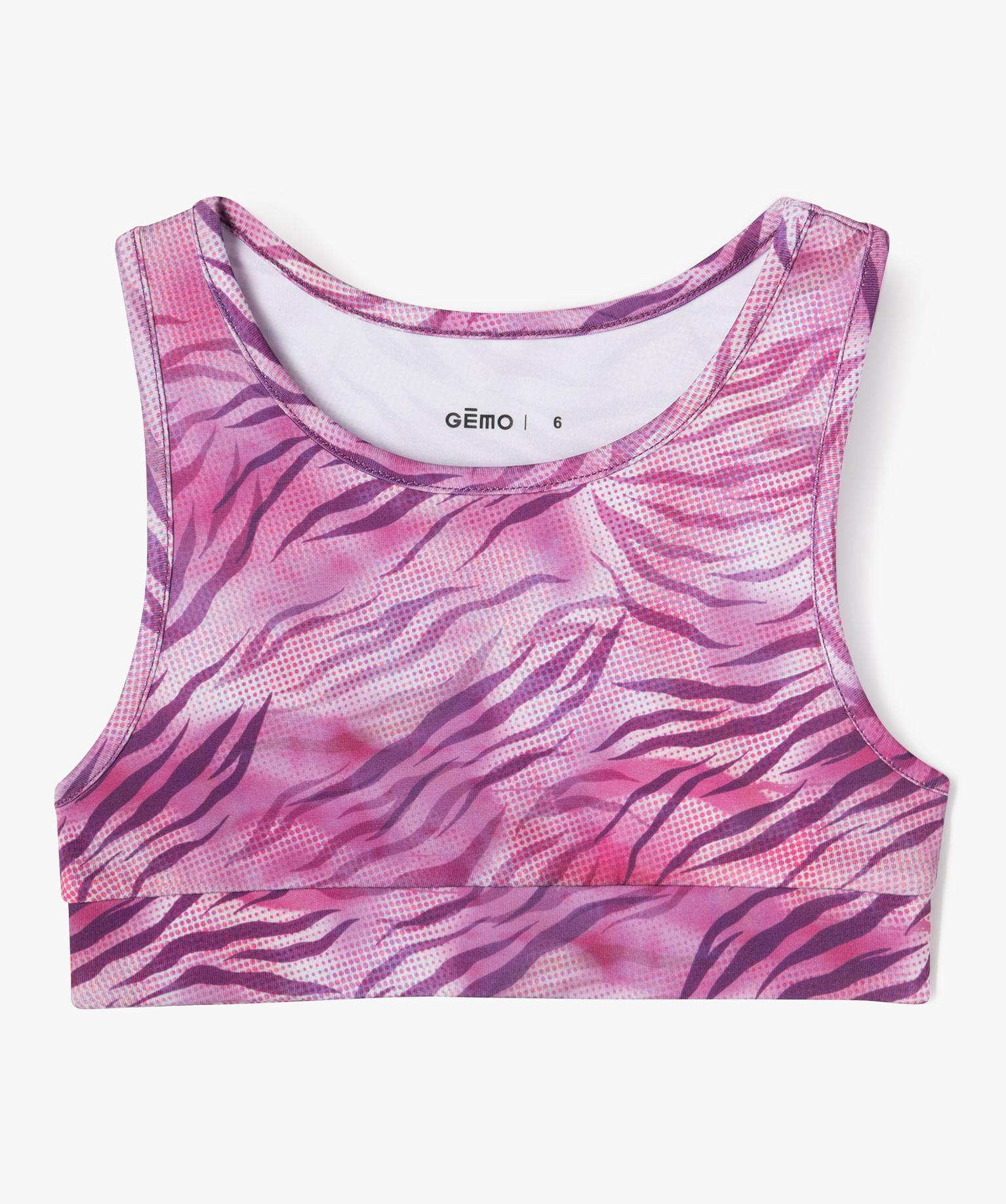 Confortable et girly, ce débardeur de sport pour fille présente une coupe brassière dos nageur courte et près du corps, dans une matière seconde peau. Il se révèle idéal pour les activités physiques telles que la gym ou le running. Ce top sans manches est fabriqué dans une matière extensible entièrement imprimé. Il reste bien en place grâce à un large élastique plat sous la poitrine. À porter avec le legging assorti pour un total look. Finition biais au col et aux emmanchures.