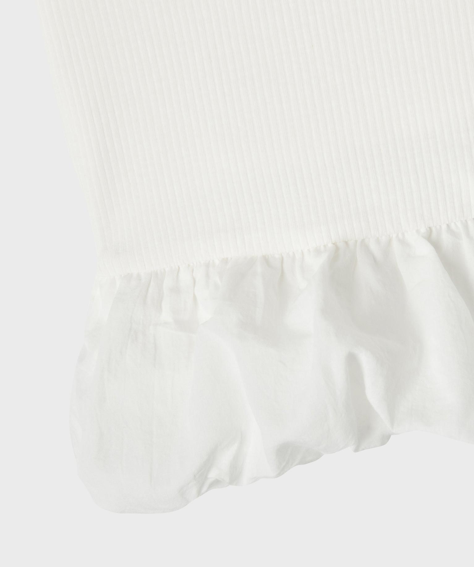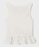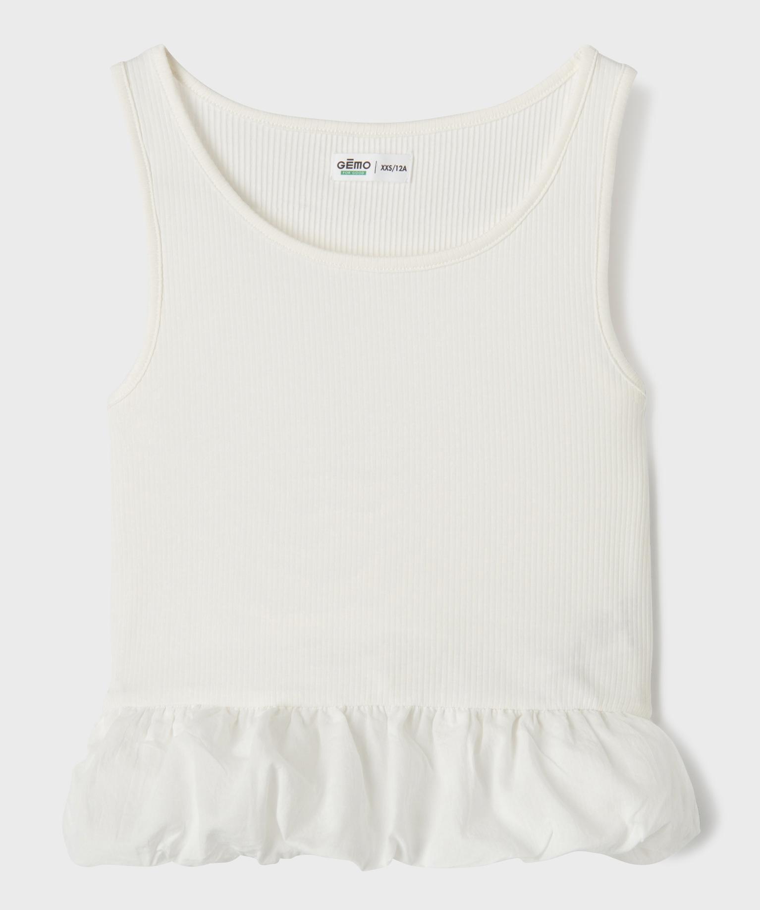 Tout en délicatesse, ce débardeur pour fille revisite le genre avec une touche de fantaisie. Réalisé en maille côtelée extensible, il offre un confort souple et agréable. La silhouette s’anime grâce à une basque en voile de coton élastiqué qui crée un joli volume blousant et léger. Son décolleté rond bien dégagé, associé à ce charmant détail et aux finitions biais au col et aux emmanchures, évoque l’esprit gracieux d’une tenue de ballet. Décliné en plusieurs coloris, ce débardeur original accompagne à merveille une jupe tube en stretch ou un short en toile.