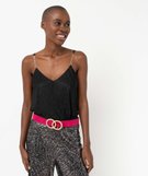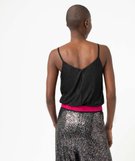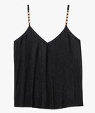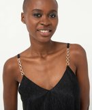 Ce magnifique débardeur pailleté vous permettra de briller de mille feux en soirée ! Un débardeur femme confectionné dans une maille fluide légèrement gaufrée offrant de jolis reflets scintillants. Il possède de fines bretelles agrémentées d’une petite chaine métallique sur l’avant. Ce top de soirée possède un double décolleté en V pour sublimer le décolleté et le dos.