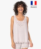 Un débardeur pour femme incrusté de fil lurex issu d’une véritable prouesse technologique. Les collections en maille 3D sont conçues par nos équipes à St-Pierre-Montlimart (49) et confectionnées à St-Malo (35) dans le premier atelier de tricotage 3D de France. Le tricotage en 3D permet de fabriquer des produits en une seule pièce et avec un seul fil. Un procédé de fabrication innovant qui assure une qualité de confection supérieure et permet une réduction des déchets de matière lors de la phase de production. La maille fabriquée en 3D affiche des finitions sans couture et limite les risques d’effilochage et de déchirure du produit. Ce débardeur en maille 3D possède de fines bretelles aux finitions roulottées et un large col rond agrémenté d’une maille fantaisie ajourée sur le haut du buste. Ce débardeur pailleté, offre un tomber fluide qui sublime les formes. Il se porte avec le short assorti, comme tenue d’intérieur ou en tenue de plage par-dessus un maillot de bain. Vous pourrez également porter ce débardeur fluide avec un short en jean et des sandales plates pour un look bohème chic au top de la tendance.