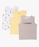 Parce qu’on n’a jamais assez de tee-shirts pour bébé, Gémo propose les débardeurs en lot de 3 ! Des débardeurs en coton avec col rond et finitions biais, dotés de boutons pression sur l’épaule pour faciliter l’habillage. Ce lot de débardeurs bébé garçon se compose d’un modèle rayé avec inscription sur la poitrine, d’un débardeur orné de bateaux à voile et d’un modèle uni avec patch brodé dans le bas. Un lot indispensable pour accompagner tous les shorts cet été.