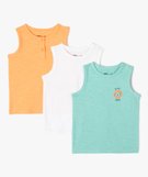 Indispensable dans le vestiaire estival des tout-petits, le lot de 3 débardeurs en coton flammé. Des débardeurs bébé garçon arborant chacun un signe distinctif : l’un est orné d’un petit motif, un autre possède une poche poitrine et le dernier des boutons sous le col. Déclinés dans des couleurs acidulées, ces T-shirt sans manches apportent une touche de dynamisme à toutes les tenues de l’été. Col rond finition biais.