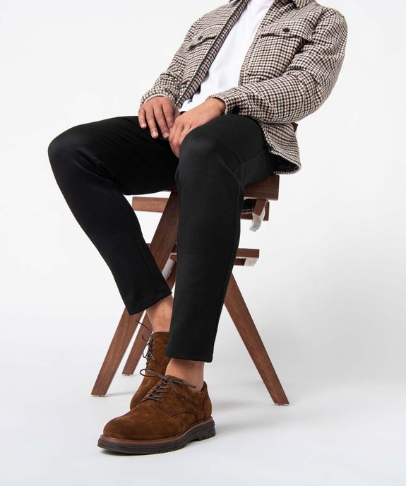 Ces derbies pour homme Tanéo offrent une belle allure contemporaine : la semelle est épaisse et crantée, avec liseré contrasté et couture débordante pour un bel effet volume. La tige en cuir retourné uni est réalisée tout en sobriété, avec surpiqûres et lacets ton sur ton. Ces derbies disposent d'une belle qualité de confection : dessus et semelle intérieure en cuir assurent souplesse et ventilation naturelle aux pieds tout au long de la journée. Fermeture lacets ronds cirés 5 œillets.