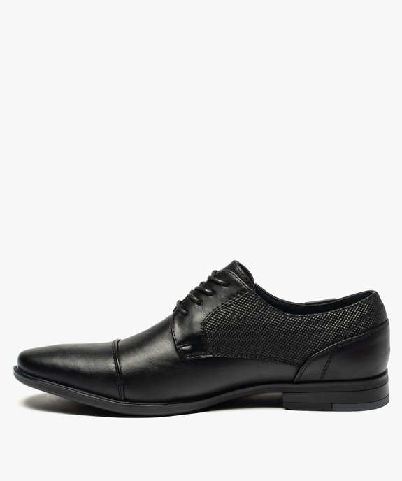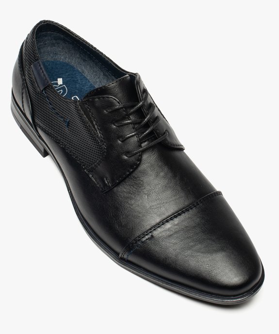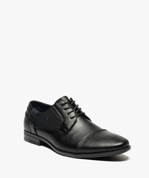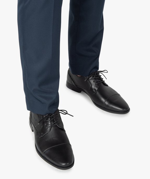 Des derbies homme originaux et élégants, parfaits pour une allure raffinée au quotidien. Leur dessus en matière synthétique se compose de deux textures différentes, l’une lisse, l’autre revêtue de reliefs sur les côtés. Ces derbies homme possèdent un empiècement avec double surpiqûre sur le bout du pied et un autre à l’arrière du talon. Un discret élastique d’aisance sur le dessus assure un excellent confort. Ces derbies sauront mettre en valeur un pantalon en toile et une chemise.