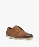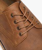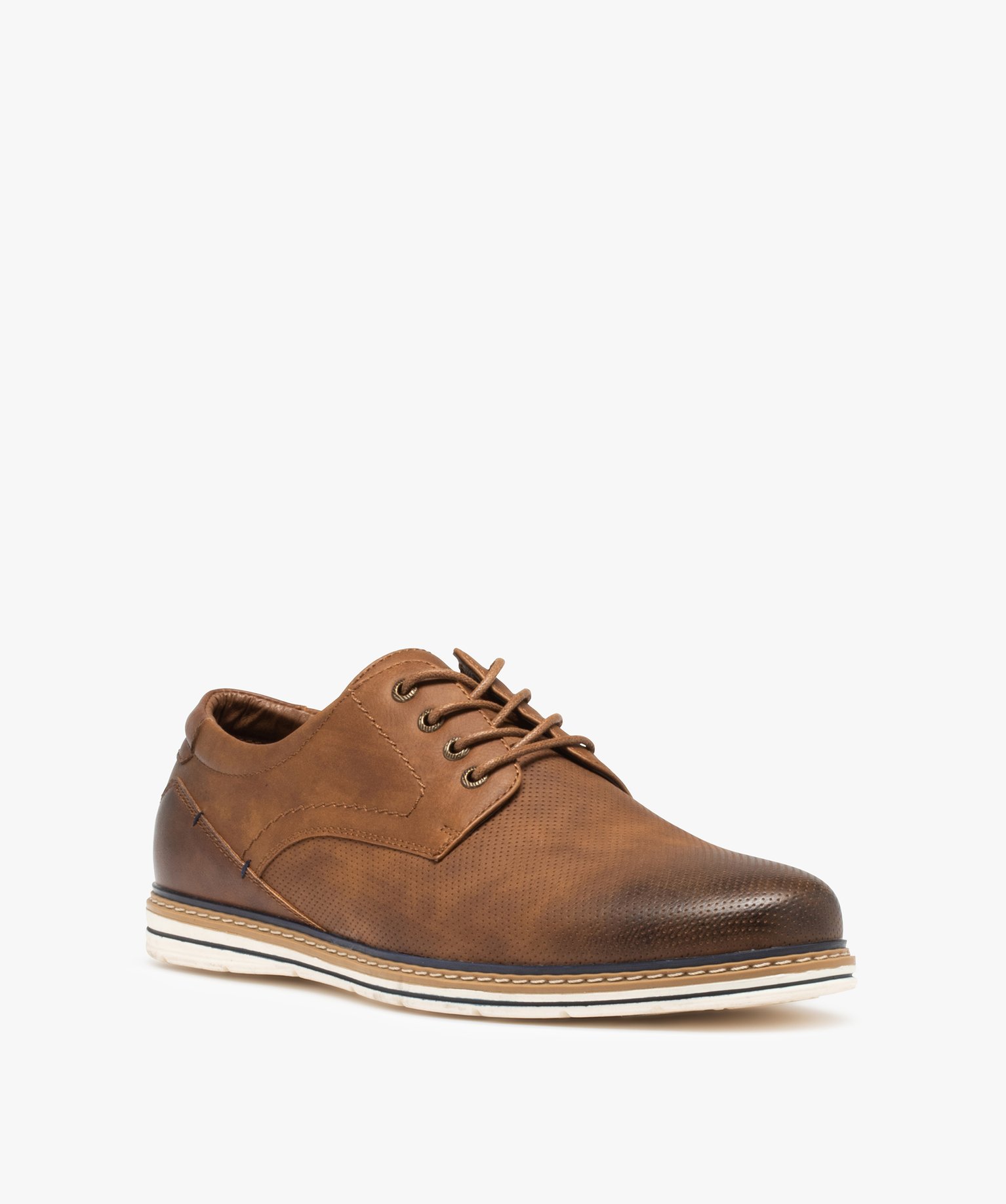 Toujours aussi élégants, les derbies pour homme adoptent ici une allure décontractée. La semelle contrastante est marquée de plusieurs liserés colorés et les œillets sont en métal vieilli : des finitions qui apportent un joli twist à cette classique chaussure de ville. La tige est en matière synthétique cuir imitation avec effet perforé sur le dessus et vieilli sur l’avant de la chaussure. Ces derbies casual seront parfaits pour compléter vos jeans et chinos. Fermeture lacets ronds cirés 4 œillets en métal.