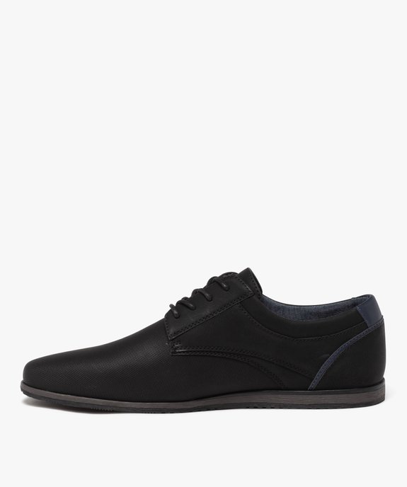 Des chaussures plates élégantes que vous pouvez porter en toutes circonstances. Leur bout présente une jolie forme en amande. Reprenant tous les codes classiques du genre, ces derbies pour homme s'équipent de lacets ronds cirés ton sur ton. Ces chaussures pour homme au style urbain se démarquent avec une semelle contrastée par une couche intermédiaire colorée et une tige grainée. Avec une tenue chic ou casual, ces derbies modernes vont faire la différence.