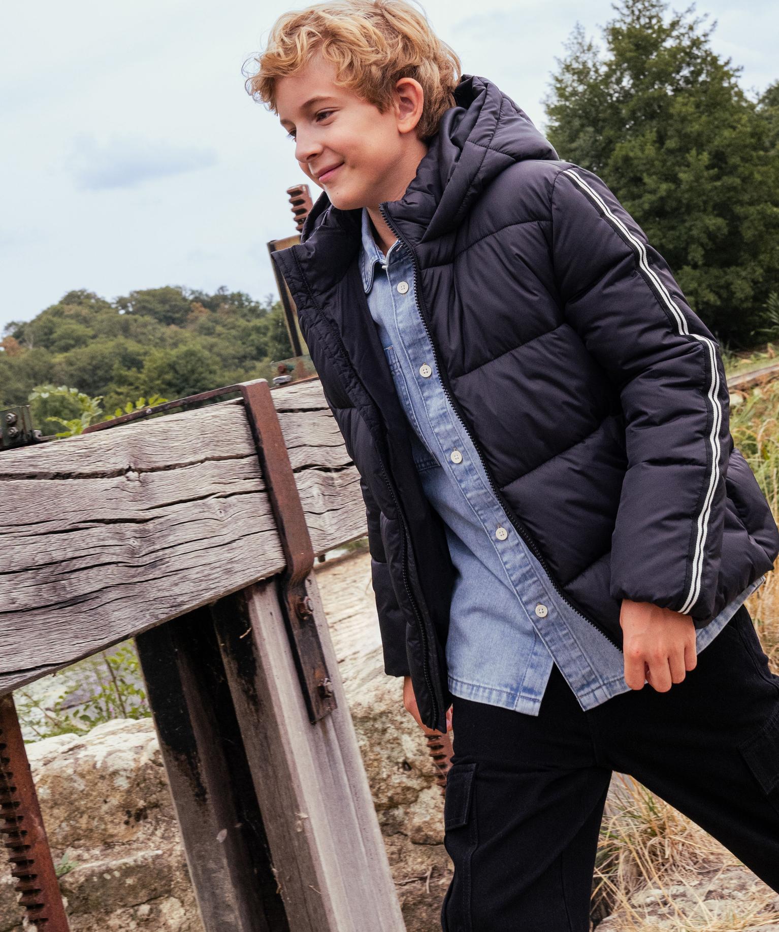 Doudoune garçon à col montant et capuche : un manteau alliant chaleur et style sportif ! Avec son matelassage rembourré épais, cette doudoune assure une excellente isolation contre le froid. La finition élastiquée aux poignets et dans le bas empêche l'air de s'engouffrer. La fermeture zippée avec patte de protection au menton protège encore mieux des intempéries. Pratique, le manteau dispose de 2 poches raglan et d’une poche plaquée intérieure pour ranger les petits essentiels. Le galon rayé le long des manches apporte une touche dynamique et sportswear. Un incontournable pour l'hiver, pour un look confortable et stylé !