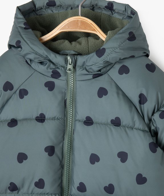 Pour assurer à votre bébé un maximum de chaleur et d’élégance, optez pour ce joli blouson matelassé à motifs. Ce blouson bébé fille est doublé d’une maille polaire sur la partie buste et jusque dans la capuche. Sur les manches, une doublure satinée facilite l’habillage. Cette doudoune bébé possède deux poches latérales dissimulées dans les coutures et se ferme par zip. Un blouson à petit prix qui convient à toutes les bourses ! Avec son allure girly il réchauffera toutes les tenues des petites princesses.